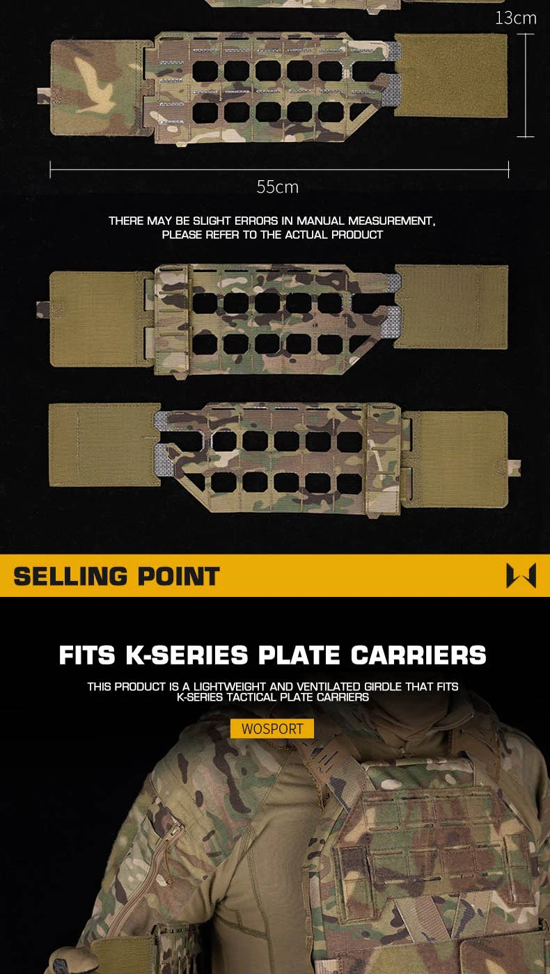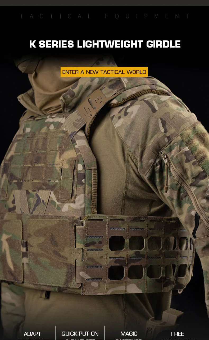 Característica: 1.Compatible con chalecos de la serie K: este fajín porta platos está diseñado con una estructura liviana y transpirable, lo que lo convierte en un ajuste ideal para los chalecos de la serie K.La faja liviana de la serie K garantiza comodidad y eficiencia durante su uso. 2.Fuerte fijación adhesiva: la faja molle utiliza conexiones adhesivas fuertes para sujetarse de forma segura a su chaleco, lo que facilita su colocación y extracción.Este adaptador de faja proporciona una solución de sujeción rápida y confiable para su equipo. 3.Estiramiento elástico: la parte trasera del cinturón molle cuenta con bandas elásticas que ofrecen elasticidad.Este diseño permite un ajuste cómodo y flexibilidad, mejorando su movilidad y comodidad durante las operaciones. 4.Accesorios de liberación rápida: los usuarios pueden instalar accesorios de liberación rápida en esta faja portaplacas para ponerse y quitarse rápidamente el chaleco.Esta característica es esencial para transiciones rápidas y situaciones de emergencia, lo que hace que la faja liviana de la serie k sea una opción práctica. 5.Opciones de montaje MOLLE: El grupo Molle incluye tres filas de correas MOLLE, lo que brinda opciones de montaje interno o externo.Esto le permite colocar la mayoría de las bolsas MOLLE, mejorando la versatilidad y funcionalidad de su configuración con el cinturón Molle.
