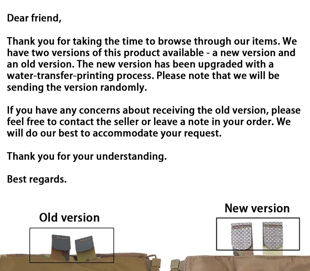 Gracias por tomarse el tiempo de navegar por nuestros artículos.Disponemos de dos versiones de este producto: una nueva versión y una versión antigua.La nueva versión se ha actualizado con un proceso de impresión por transferencia de agua.Tenga en cuenta que enviaremos la versión al azar.