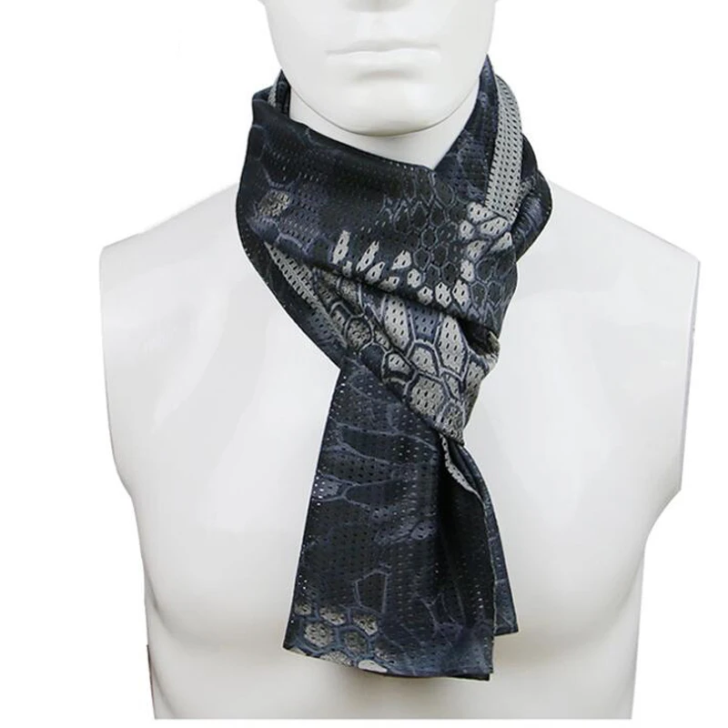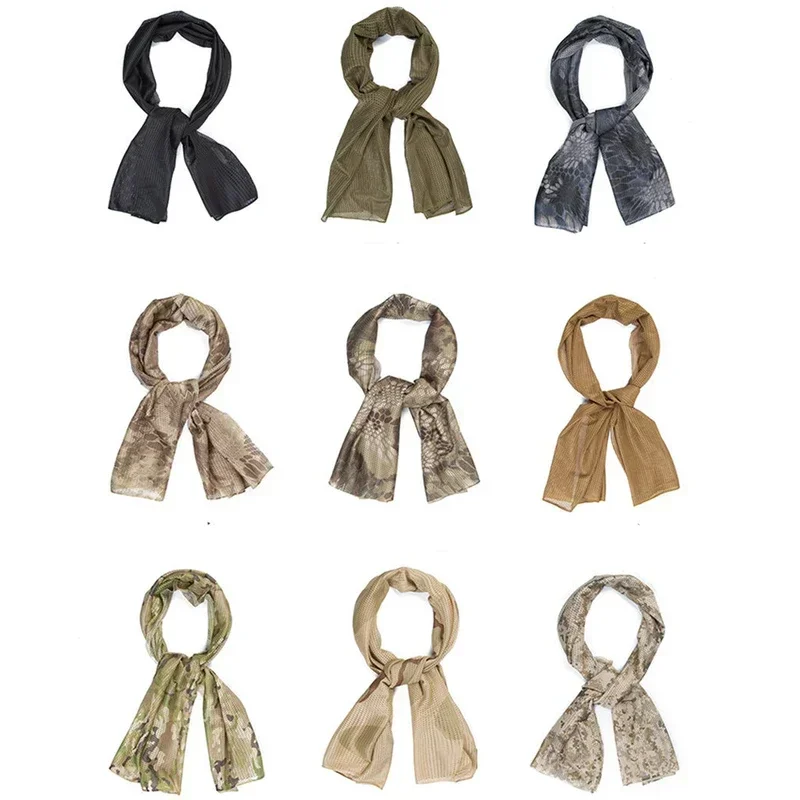 -Esta bufanda de malla se usa en la jungla y el desierto, excelente transpirabilidad con múltiples orificios en la tela que anteriormente es aplicable a los mosquitos o antipolvo, y ahora se usa ampliamente para disfrazarse en actividades tácticas.