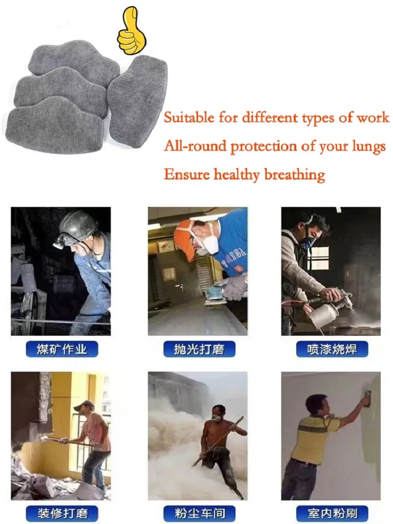* El algodón con filtro de carbón activado tiene 6 capas, que pueden filtrar partículas grandes eficazmente en el aire, y es ampliamente utilizado en minería, pulido, carpintería, construcción y otras escenas. Puede ayudarle a limpiar un ambiente de respiración saludable.