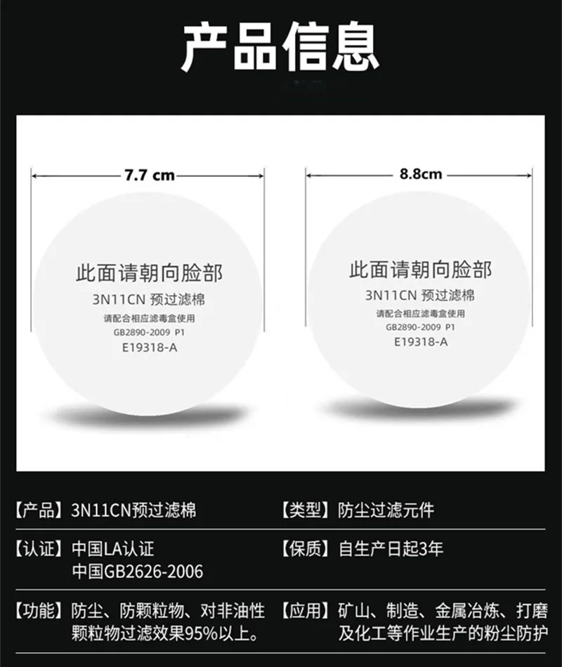El algodón de filtro 3N11 es adecuado para máscaras antipolvo 308 y 8200, y también adecuado para máscaras antigas 3200, 308 y 8200. Como se muestra a continuación: