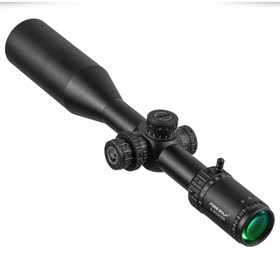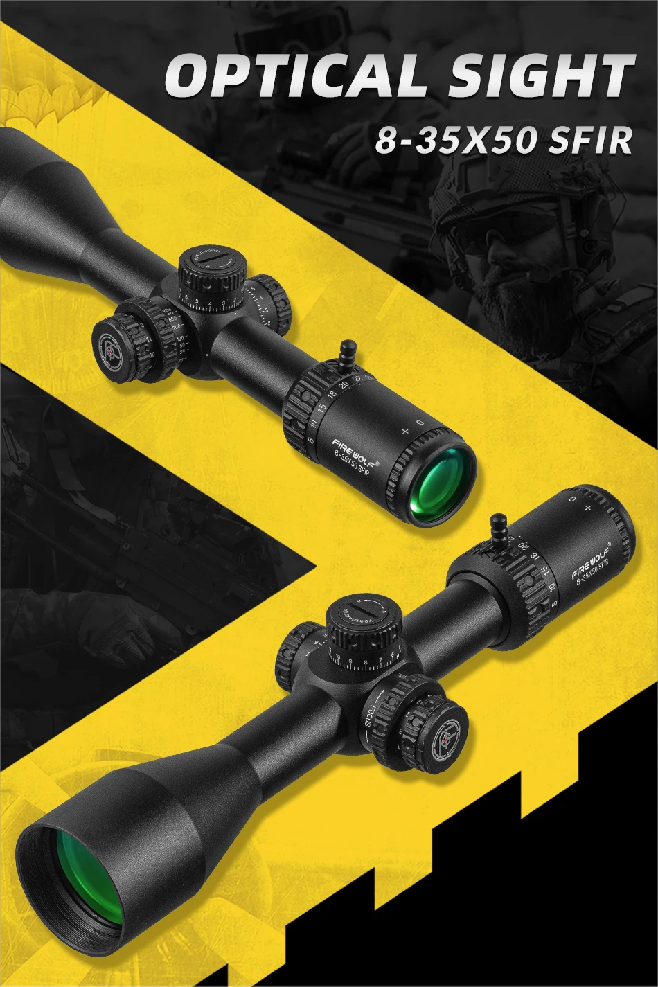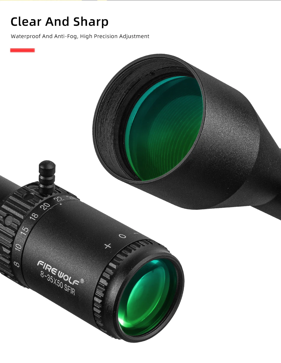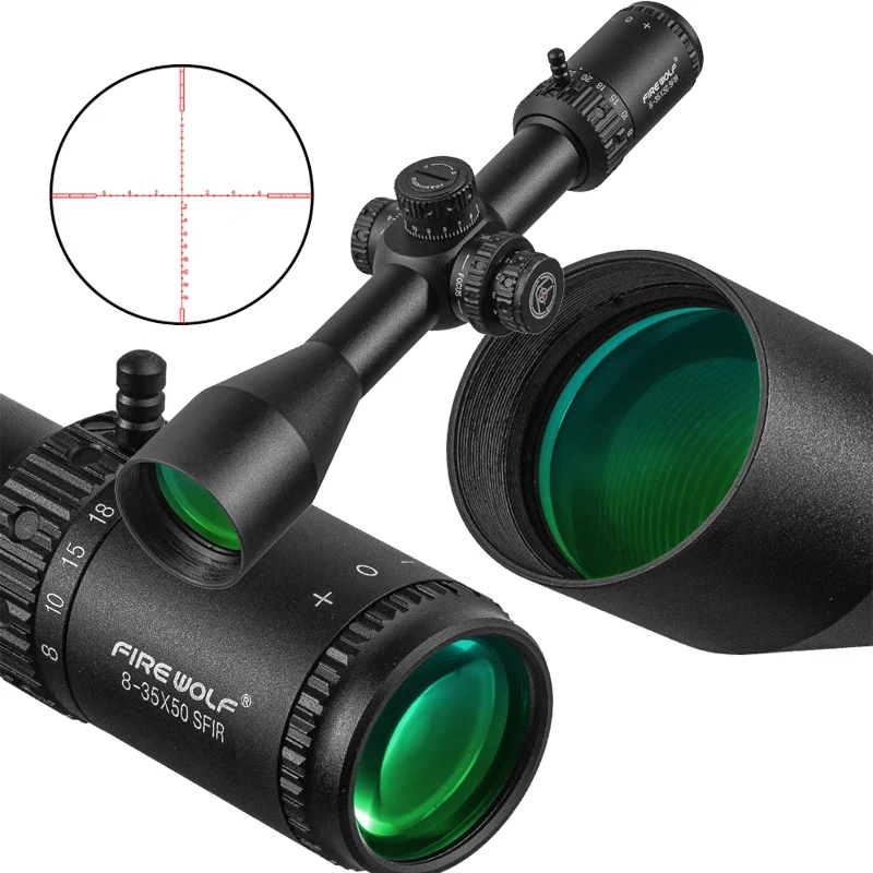 FIRE WOLF 8-35X50 SFIR alcance caza alcance vidrio rojo iluminación retícula lateral parallax torreta bloqueo reinicio