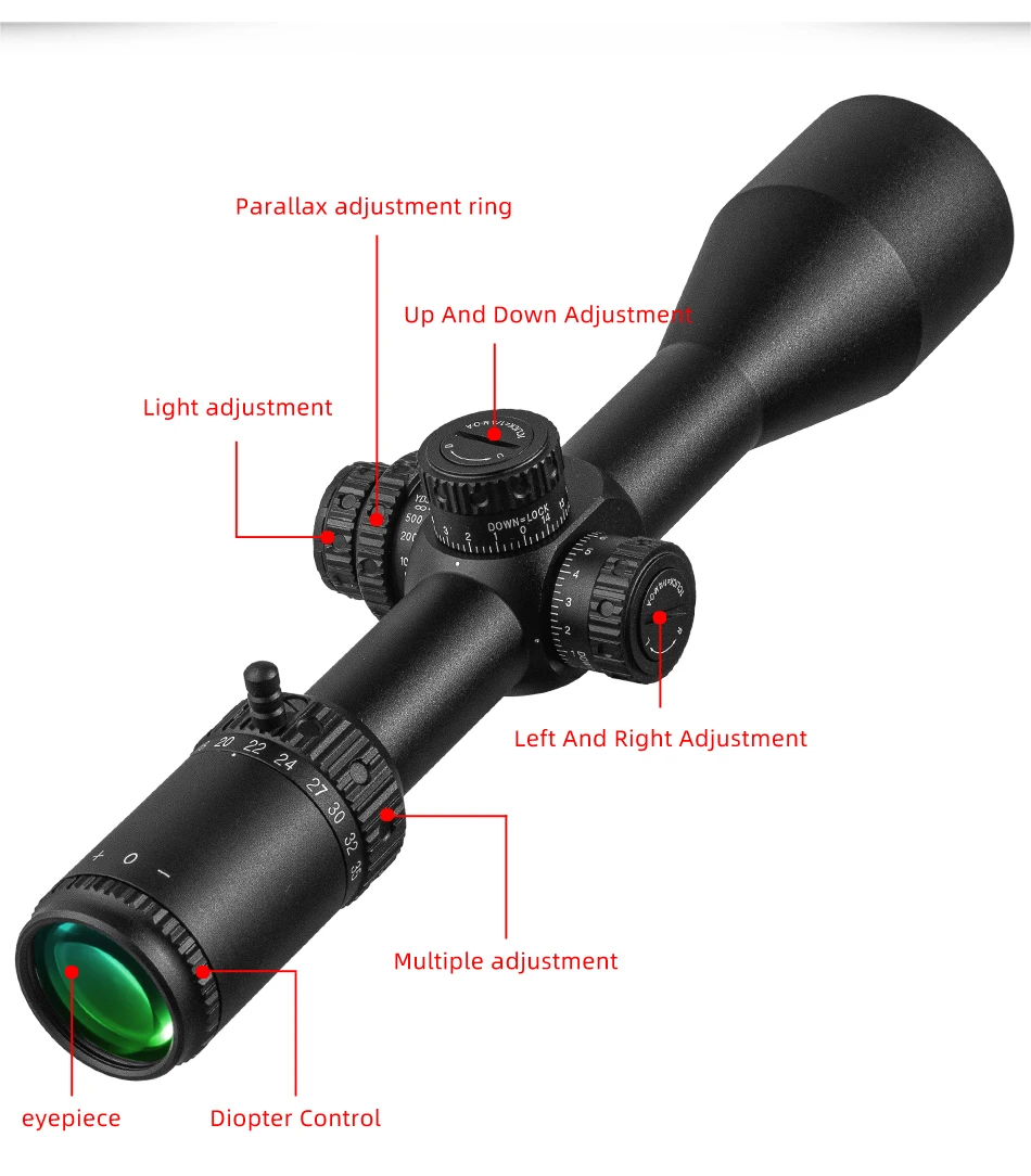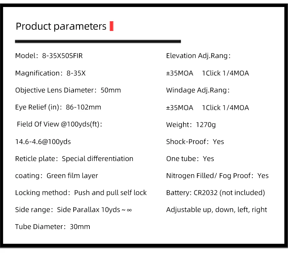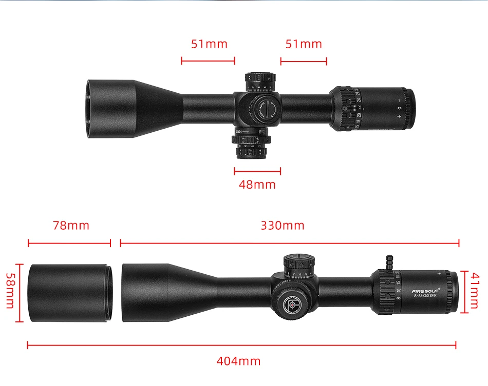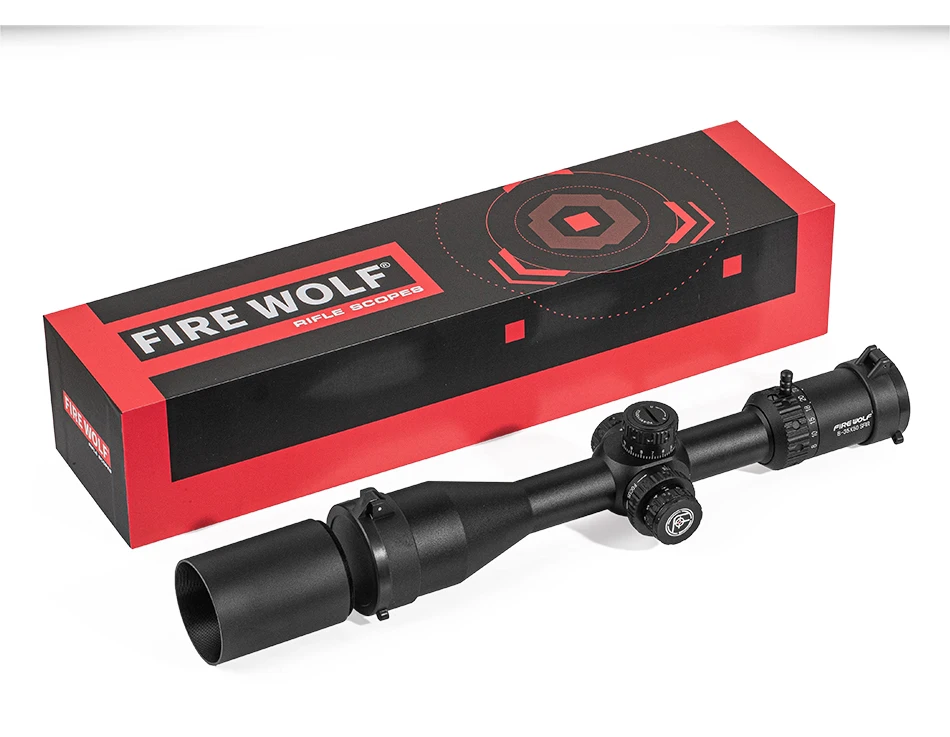 FIRE WOLF 8-35X50 SFIR alcance caza alcance vidrio rojo iluminación retícula lateral parallax torreta bloqueo reinicio