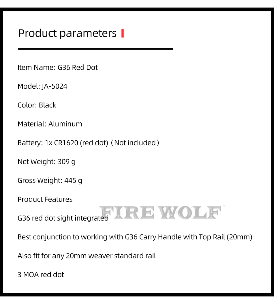 FIRE WOLF G36 Red Dot Sight Scope Soporte de riel holográfico de 20 mm para óptica de caza táctica