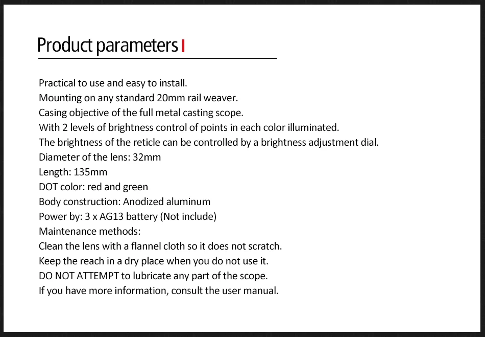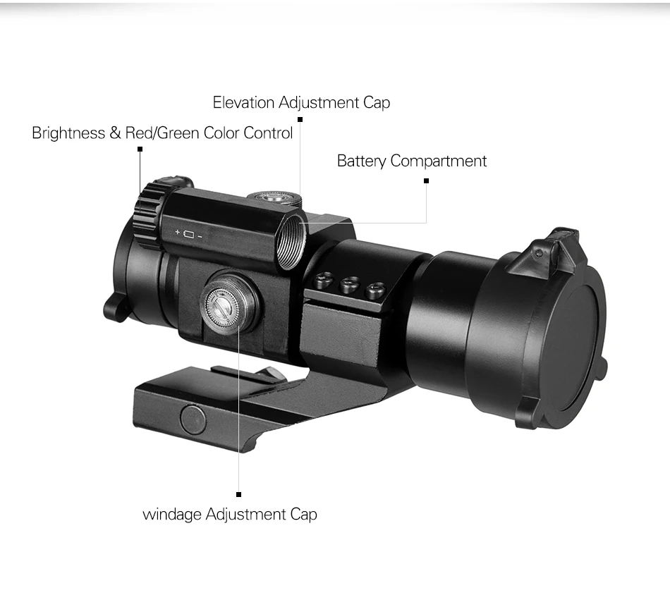 Muy buen colimador con montura alta, lo único es que no puedo acoplarlo a una superficie muy resistente. El interruptor y el cambio de color del punto funcionan mal, tiempo de envío largo.