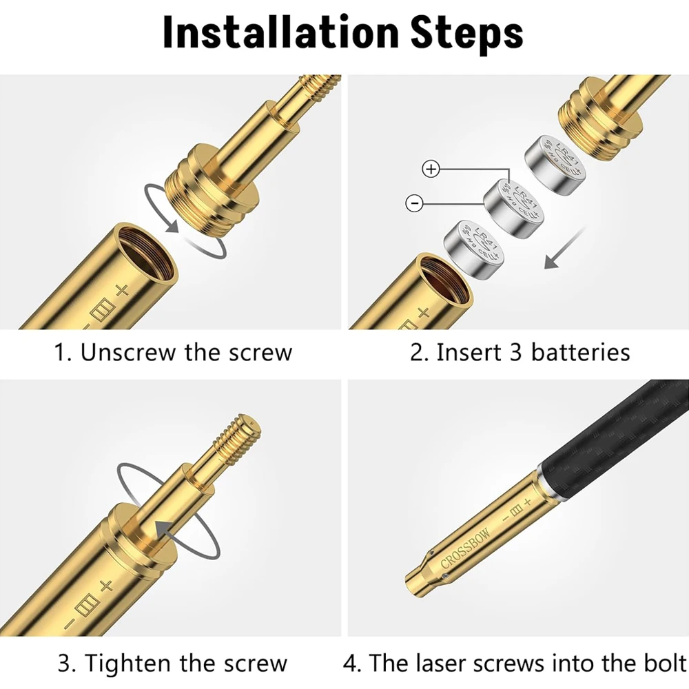 Inserte 3 baterías, apriete el tornillo y el láser rojo brillante se activará automáticamente.Gírelo al extremo del perno, colóquelo en la ballesta y comience a alinearlo.No hay interruptor de apagado, retire las baterías cuando termine de usar la mira láser de baliza.