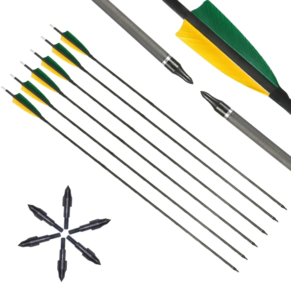 Flechas de carbono de 32 pulgadas para práctica de caza, columna vertebral 400 con plumas reales de 4 ", puntas extraíbles para arco compuesto y recurvo