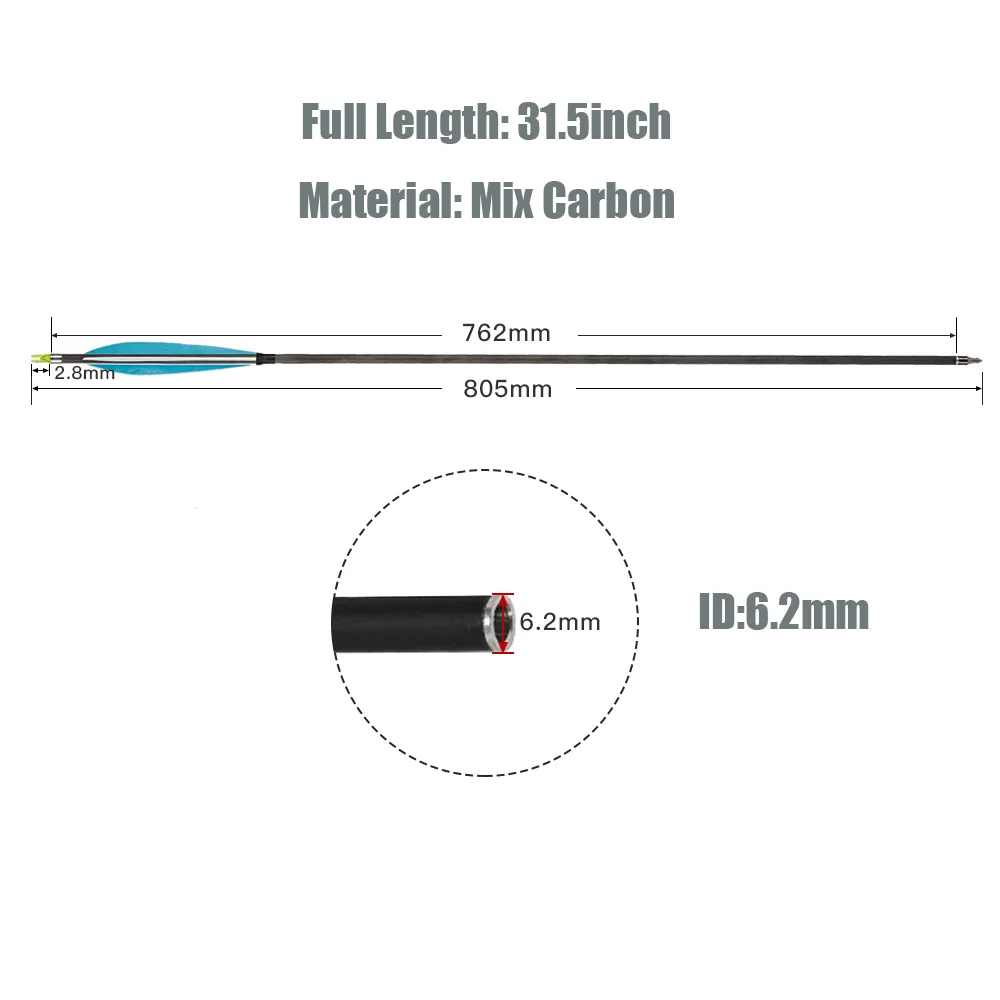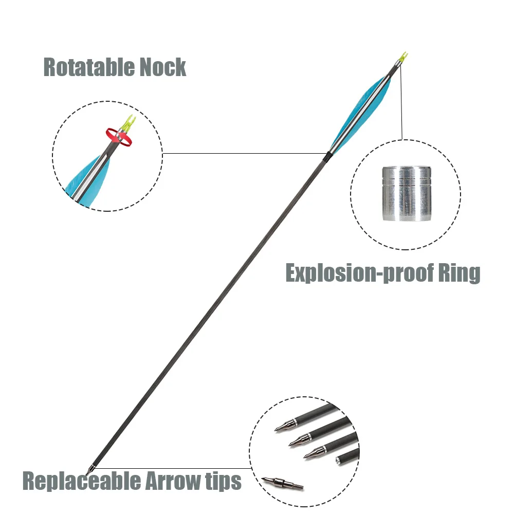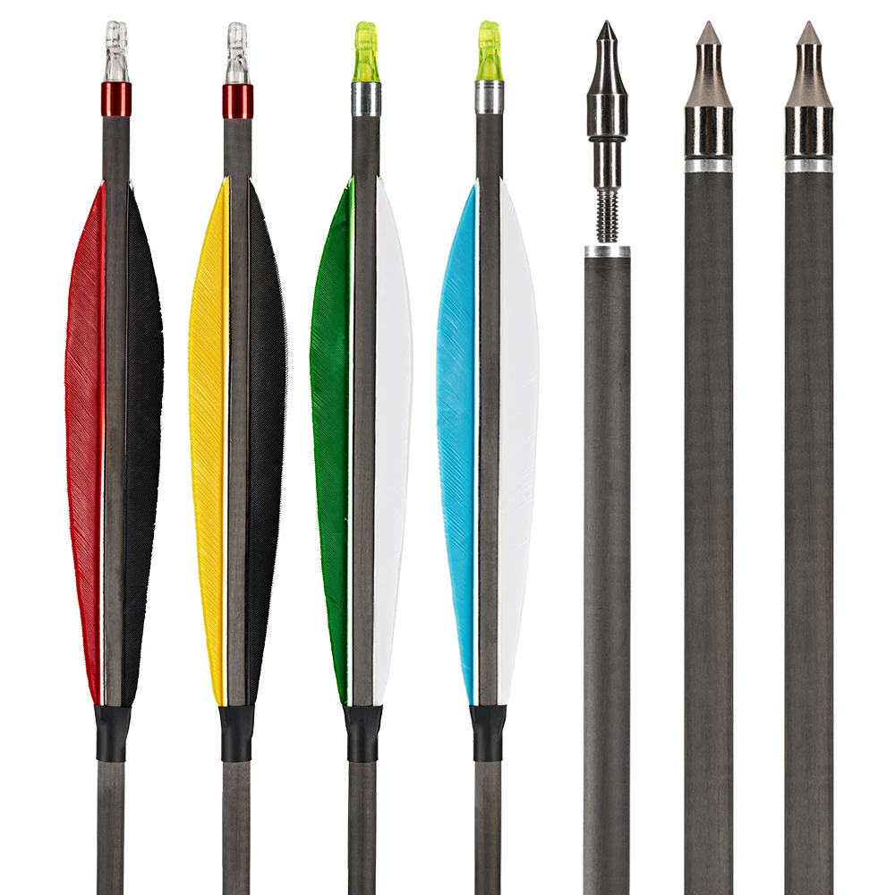 Flechas de carbono de 31,5 pulgadas con espina de pluma verdadera de 6 pulgadas 350 punta de flecha reemplazable para caza al aire libre tiro arco recurvo compuesto