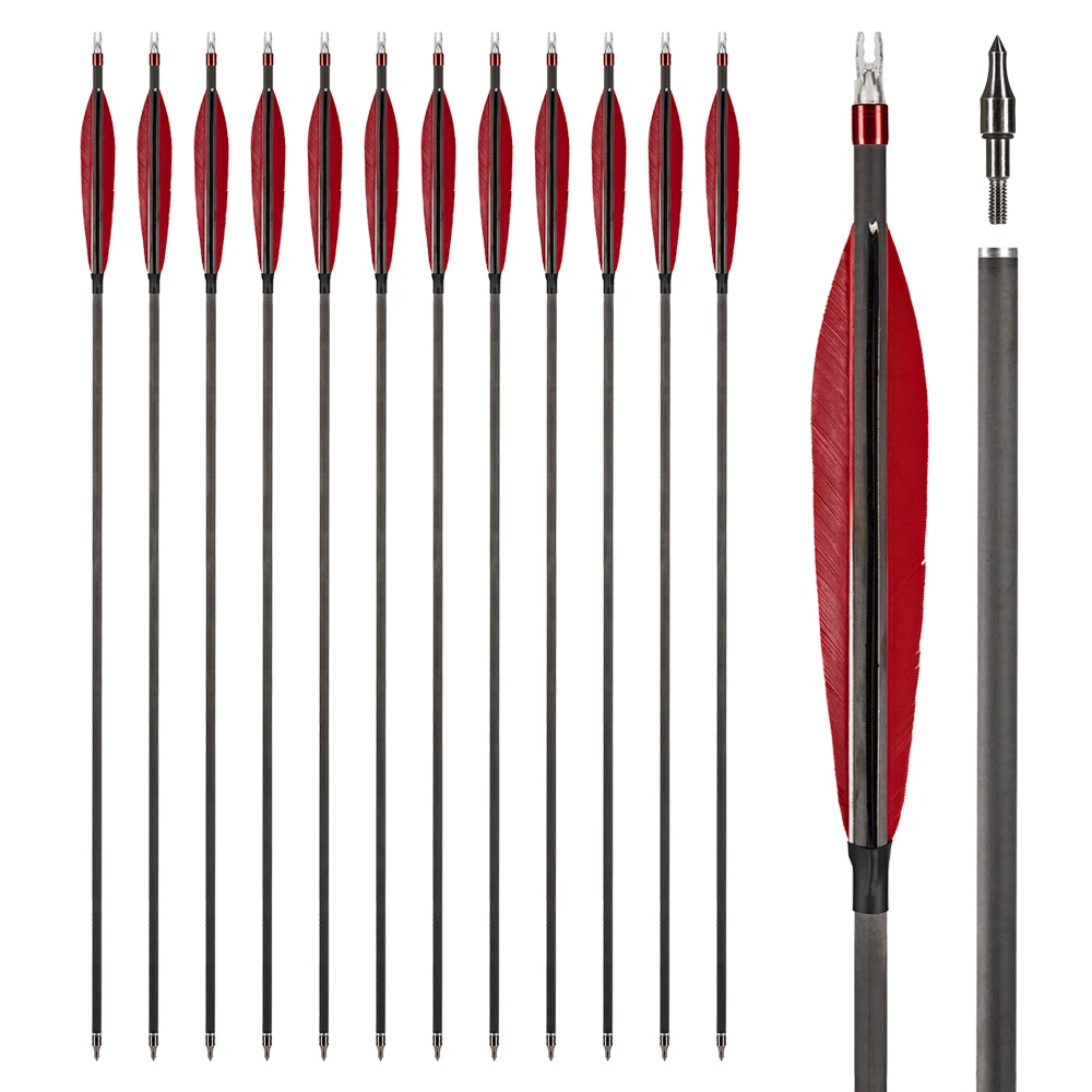 Flechas de carbono de 31,5 pulgadas con espina de pluma verdadera de 6 pulgadas 350 punta de flecha reemplazable para caza al aire libre tiro arco recurvo compuesto