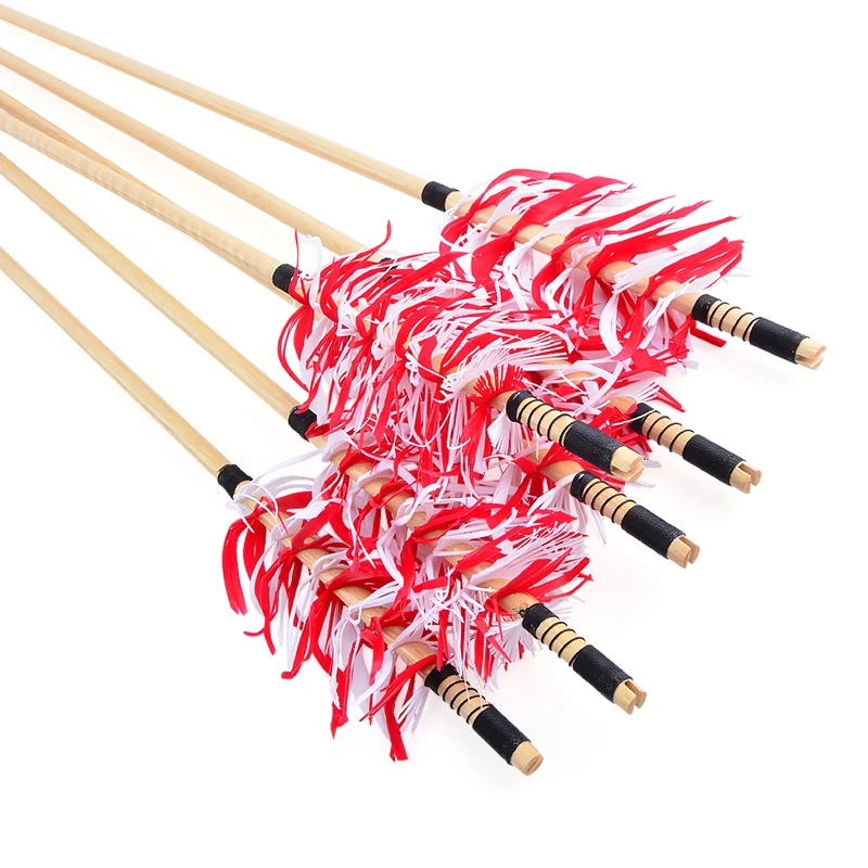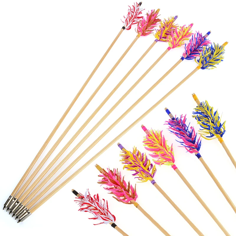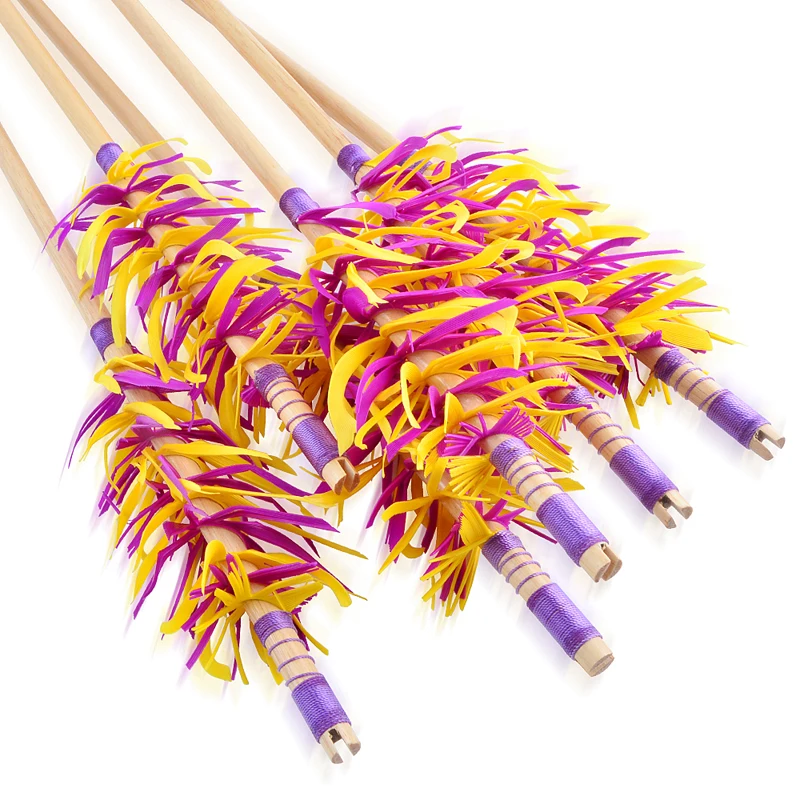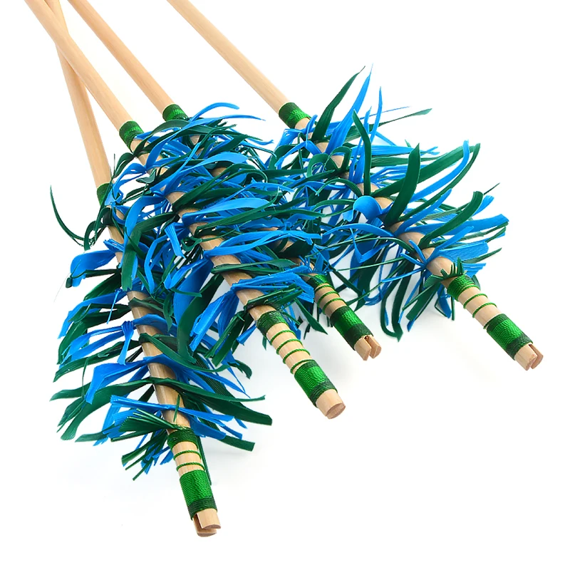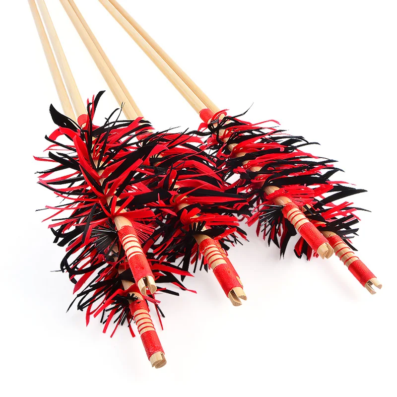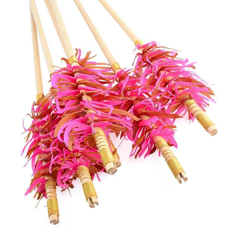 Las plumas de flecha son plumas originales naturales que no se han recortado, que dos plumas entrelazadas en el eje de la flecha como la razón de la fabricación a mano, y habrá diferencias en la longitud. Las plumas pueden deformarse debido a la compresión durante el transporte. El vapor generado por el agua hirviendo puede hacer que las plumas se aplanen y se recuperen.