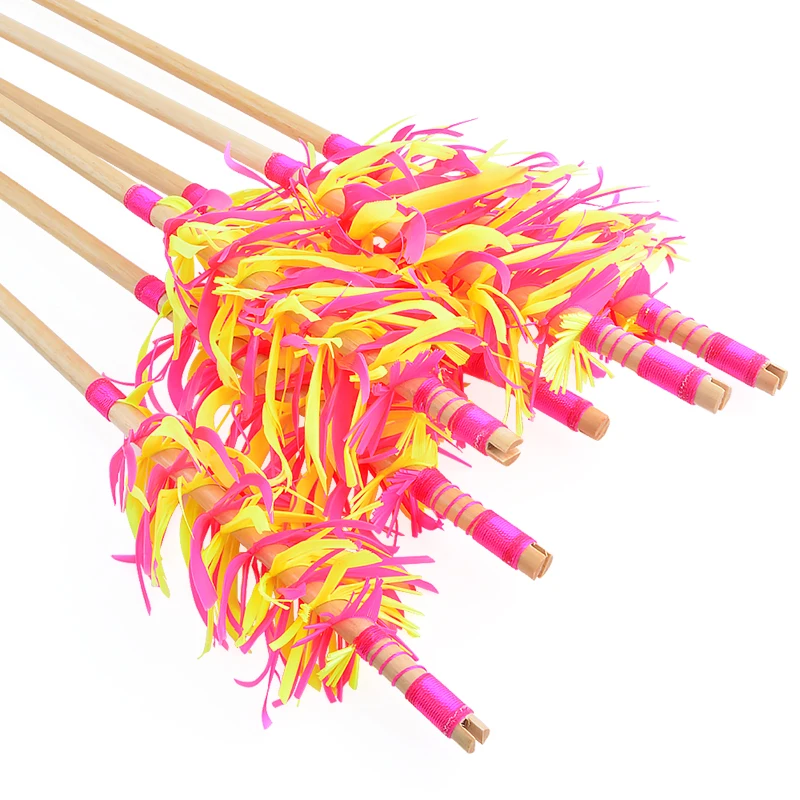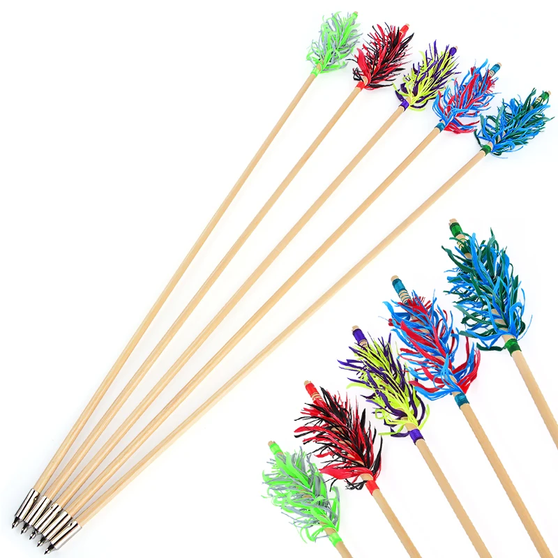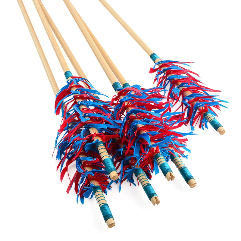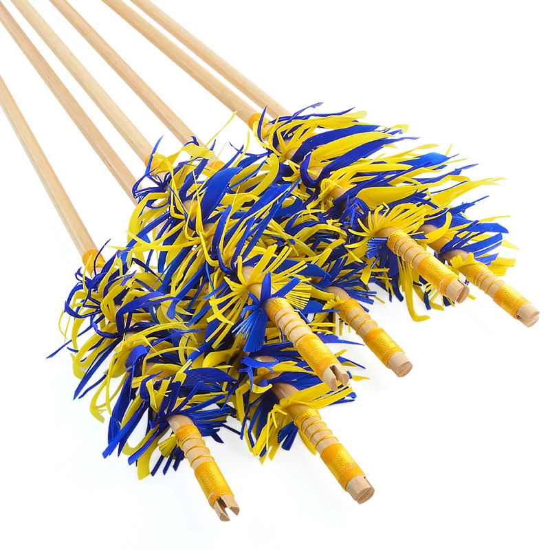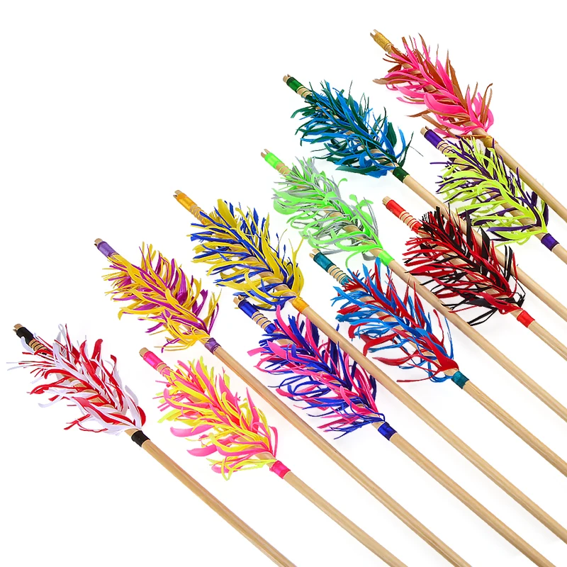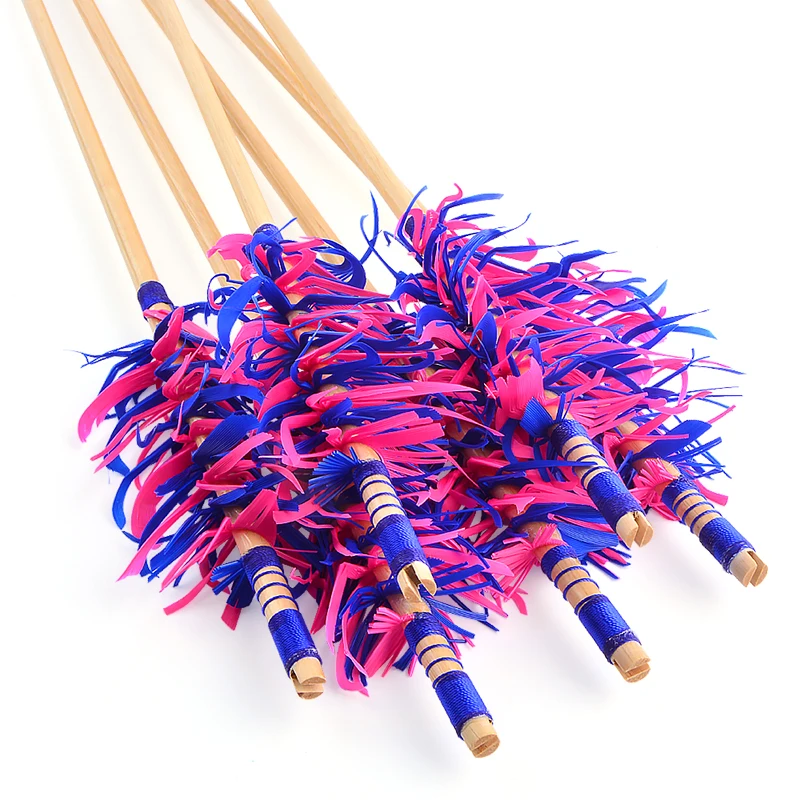 Las plumas de flecha son plumas originales naturales que no se han recortado, que dos plumas entrelazadas en el eje de la flecha como la razón de la fabricación a mano, y habrá diferencias en la longitud. Las plumas pueden deformarse debido a la compresión durante el transporte. El vapor generado por el agua hirviendo puede hacer que las plumas se aplanen y se recuperen.