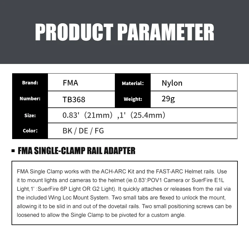 FMA-abrazadera de linterna de riel para casco, accesorio Universal de 0,83 pulgadas/1 pulgada, TB371