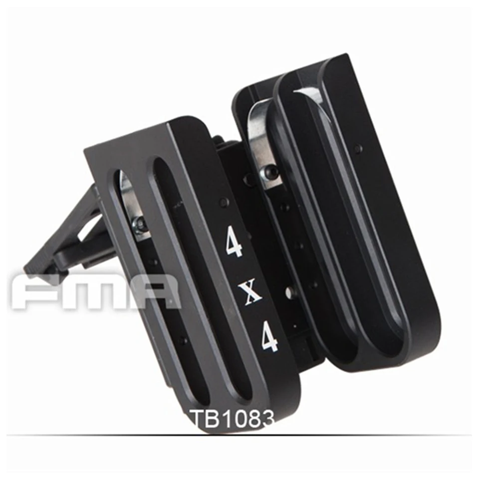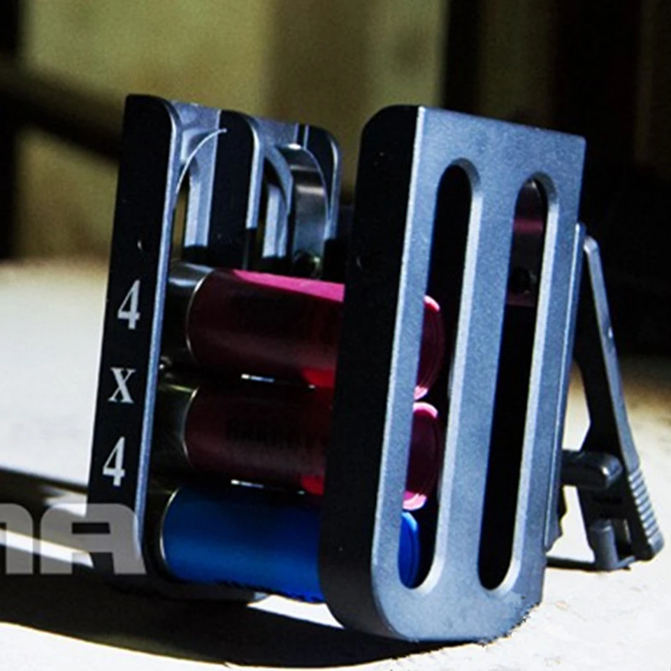 The FMA 4 Shotshell Shell Carrier has been cnc machined from a solid aircraft aluminum billet, Hard-Coat anodized to mil-spec standards, and features 303 Hi-Yield stainless retention springs. This double-stack shotshell carrier is capable of holding eight rounds of 12 gauge 2-¾" shotshells. The FMA 4x4 Shotshell Shell Carrier comes standard with a BladeTec Tec-Lock or a Safariland ELS attachment