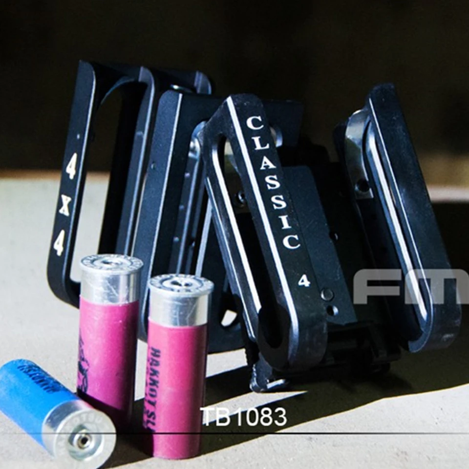1802: The FMA Classic 4 holds four 12 ga. 2 3/4 shells and is constructed of CNC machined aircraft-grade aluminum. The shotshell holder is hard-coat anodized according to military specifications, and features 303 Hi-Yield stainless retention springs. This model come standard with a Blade-Tech Tec-Lock belt attachment, which is also drilled to accept the Safariland Quick Lock brackets
