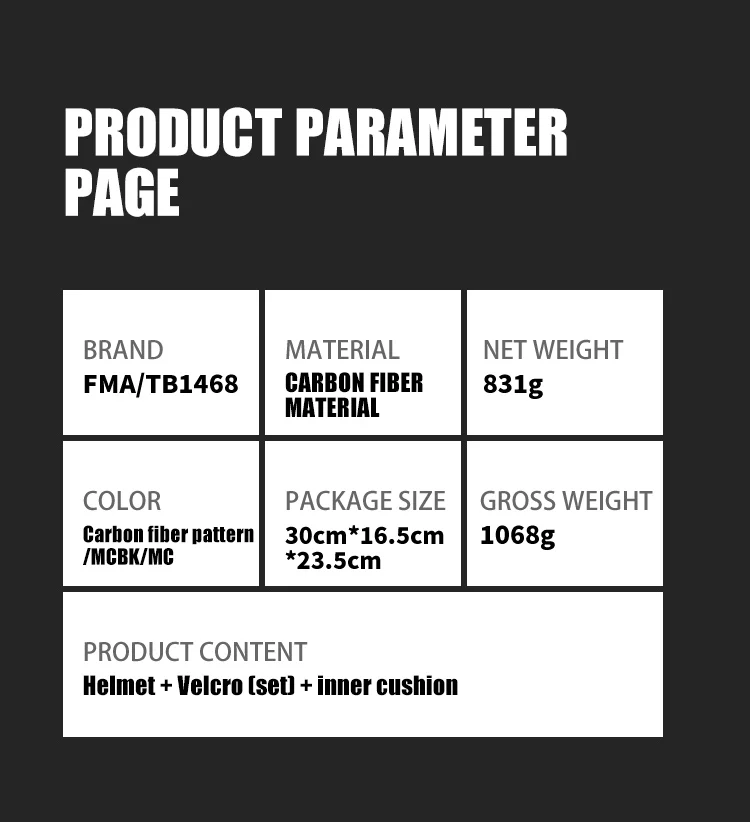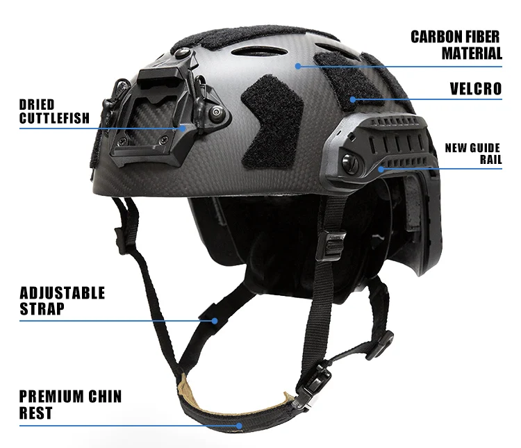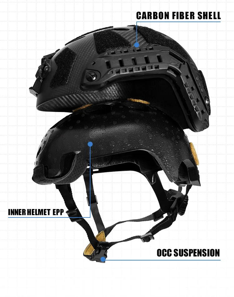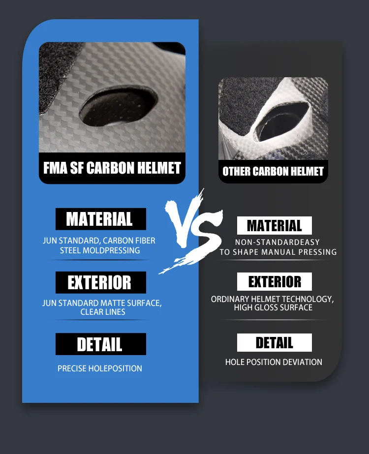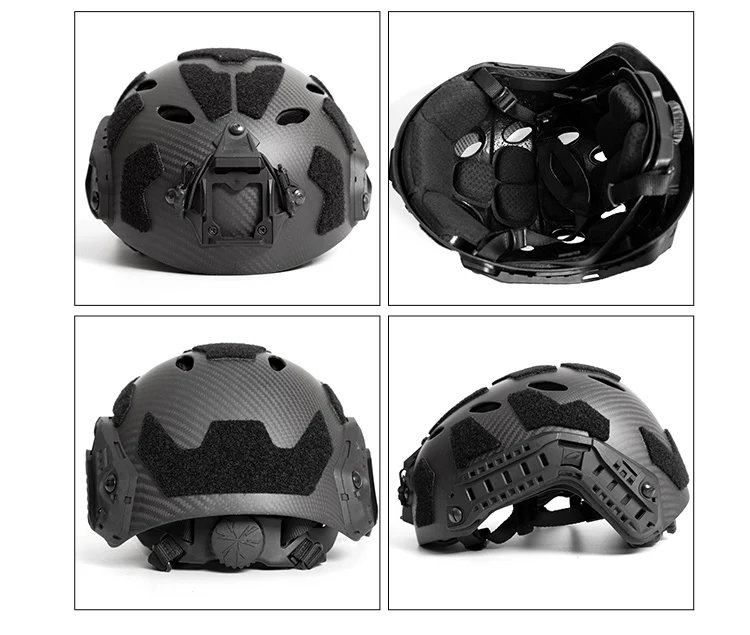 Descripción: La versión de fibra de carbono de este casco no está hecha a mano, está formada por la columna de prensa de la máquina de molde, el grosor del cuerpo del casco es uniforme, el proceso de superficie es de alta calidad, los detalles de la página de detalles son tomados por el producto., y se puede mostrar el proceso de casco fino. La ligera resistencia al impacto y las capacidades de absorción de impactos del casco SF de fibra de carbono son la base para mantener la confiabilidad de todo el sistema de casco. El versátil choco de metal del casco se puede conectar a faros, visión nocturna, cámaras de acción y otros equipos, de manera estable y duradera. Ambos lados están equipados con rieles guía multifuncionales. A diferencia de los rieles para casco normales, este riel guía se compone de dos partes, que se pueden separar y desmontar. Se puede montar un solo riel guía en un casco de fibra de carbono ligero y delgado para satisfacer las necesidades de los usuarios con una variedad de cascos. Tornillo guía fijo, se puede instalar luz indicadora, linterna, auriculares y otros accesorios funcionales. El casco está equipado con velcro original, que puede equiparse con una variedad de accesorios prácticos como insignias de identificación y luces de señalización según sus necesidades, para que su casco sea más característico.