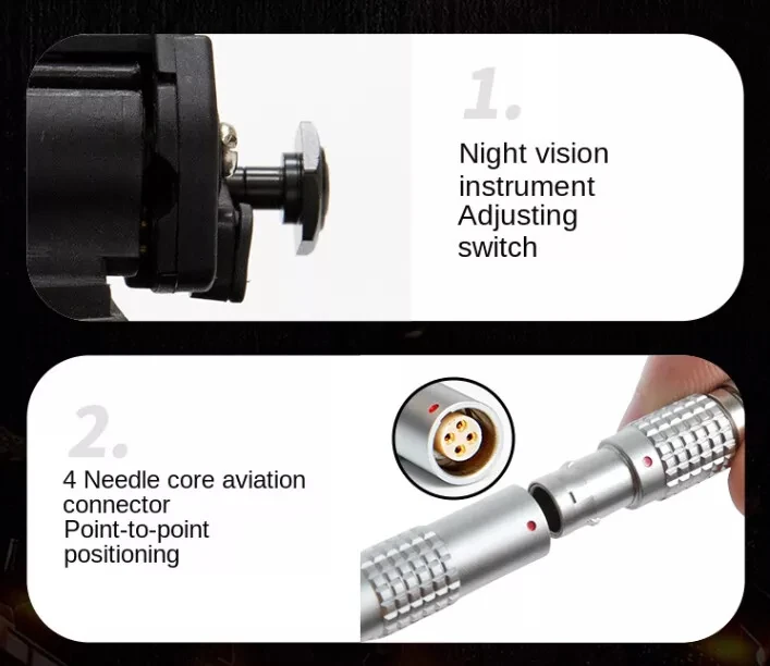 También utiliza cuatro baterías de 1,5 V y cinco, con una potencia de salida de 3 V y una longitud de cable de 36 cm.Utiliza un conector de aviación de 4 pines para posicionamiento punto a punto, enchufe y dial antideslizantes, y admite varios compartimentos de batería de alimentación de dispositivos de visión nocturna.