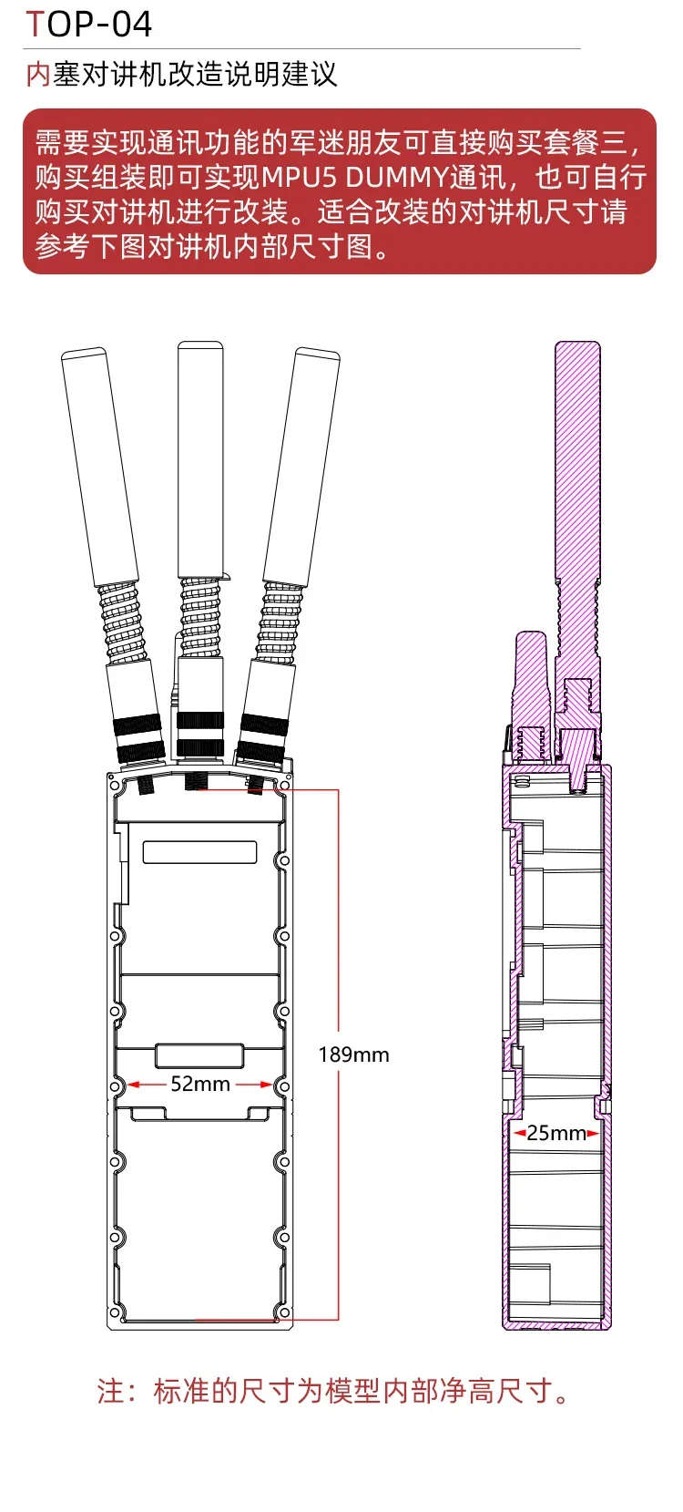 El tamaño del walkie-talkie adecuado para modificaciones consulte la siguiente figura para conocer las dimensiones internas del walkie-talkie.