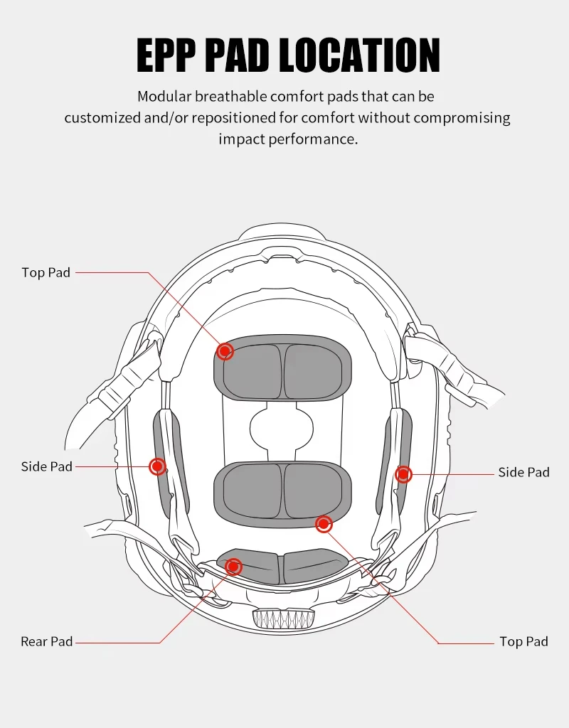 El sistema de suspensión FMAACH OC-DIAL combina un protector de choque de cobertura total de una sola pieza con una almohadilla cómoda modular y transpirable que se puede instalar o reposicionar según sea necesario para brindar mayor comodidad sin comprometer la resistencia al impacto. Diseñado con ventilaciones y una geometría más aerodinámica para mejorar el flujo de aire, la comodidad y el ajuste. La perilla OCC de baja visibilidad proporciona ajustes rápidos para garantizar la estabilidad de los dispositivos de visión nocturna. Las almohadillas cómodas están diseñadas pensando en el uso a largo plazo, son duraderas, transpirables, poco higroscópicas, extraíbles y lavables. La suspensión se integra perfectamente con todos los cascos perforados o no perforados de la serie FAST. La nueva generación del sistema de suspensión FMAACH OC-DIAL se ha mejorado en materiales EPP y algodón transpirable, así como en la sección extraíble, todas las partes están acolchadas para cumplir con los requisitos de baja visibilidad y las partes que se ajustan a la piel son mejorado. La parte del cinturón de nailon se ha cambiado a una versión más cómoda pero mejor resistente, y el proceso de corte y costura se ha modificado y el uso general será más cómodo.