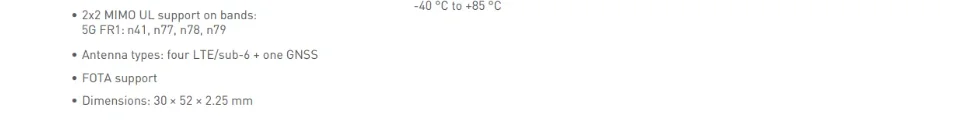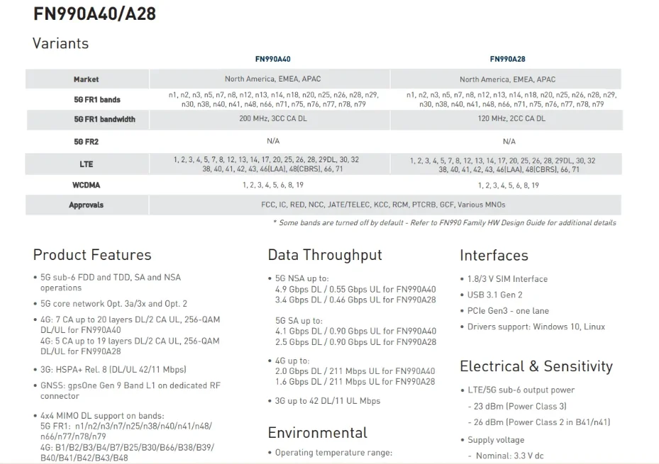 Las tarjetas de datos FN990A40 y FN990A28 ofrecen un conector/patril de RF dedicado/compartido (conmutable) para GNSS L1 para permitir total flexibilidad en la fase de diseño. Estas tarjetas de datos están disponibles con o sin soporte PC1.5 en bandas 5G TDD n41, n77, n78 y n79. Las tarjetas de datos FN990A40 y FN990A28 vienen en dimensiones de 30 mm × 52 mm × 2,25 mm y funcionan dentro de -40 ° C a 85 ° Rango de temperatura C. Las aplicaciones típicas incluyen acceso inalámbrico fijo, enrutadores y puertas de enlace empresariales, CPE para interiores y exteriores, transmisión profesional y vigilancia.