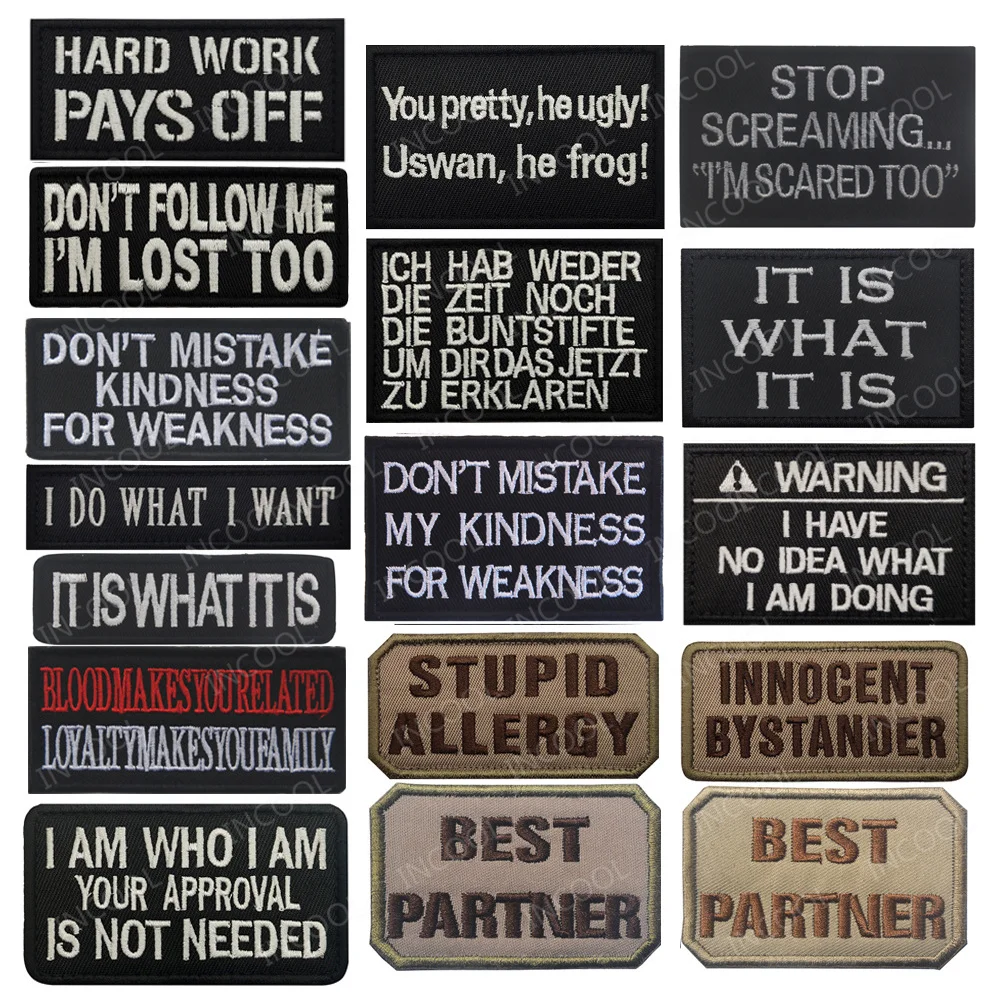 [Especificación]:Frasas motivacionales que dicen No me sigas, no tengo idea, palabras del alfabeto inglés, deja de gritar, parches bordados, apliques