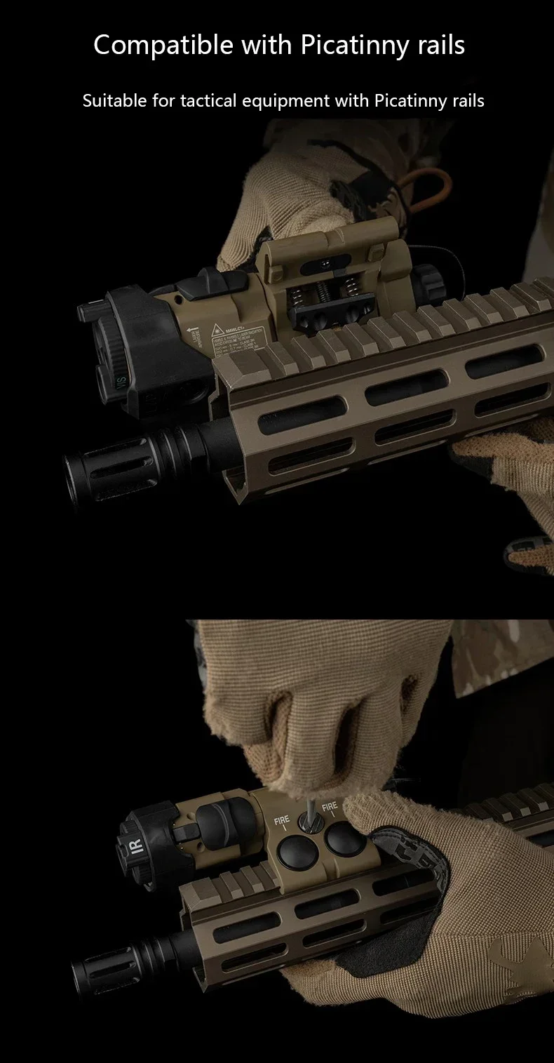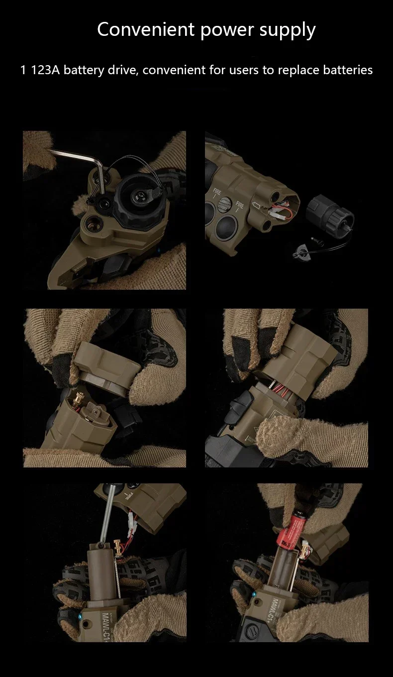 El producto funciona con 1 batería de 123A, con láser rojo/laser verde y linterna, cumpliendo con los requisitos de la mayoría de las actividades tácticas.