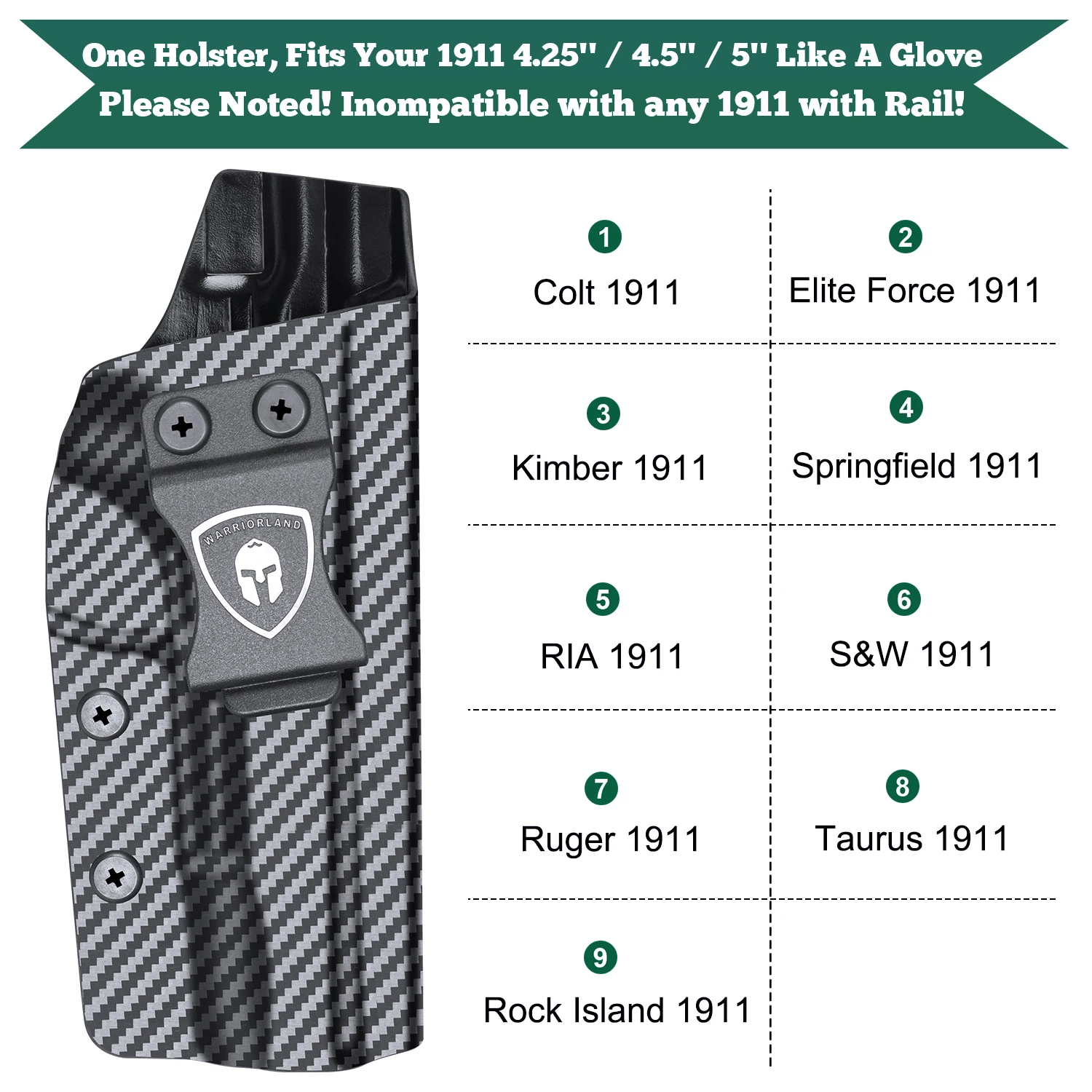 【Compatibility】 WARRIORLAND OWB Kydex holster fit: Colt 1911 45 ACP 5 "No carril incluyendo Colt/Fuerza de Élite/Kimber / Springfield / RIA / S & W / Ruger / Taurus / Rock Island y más de 1911 pistola También puede ser compatible con barril de 4,5 "o 4,25", si puede aceptar que el barril sea más larga que la funda corto (también puede cortar un poco y pulir el borde). Y encajaría con la mayoría de los puntos ópticos/rojos