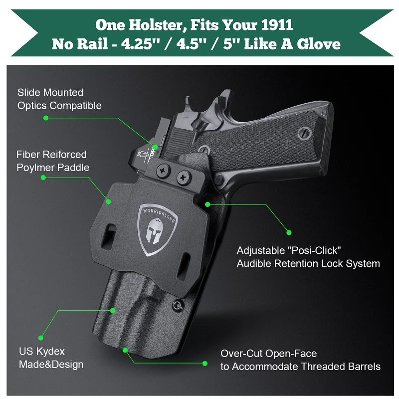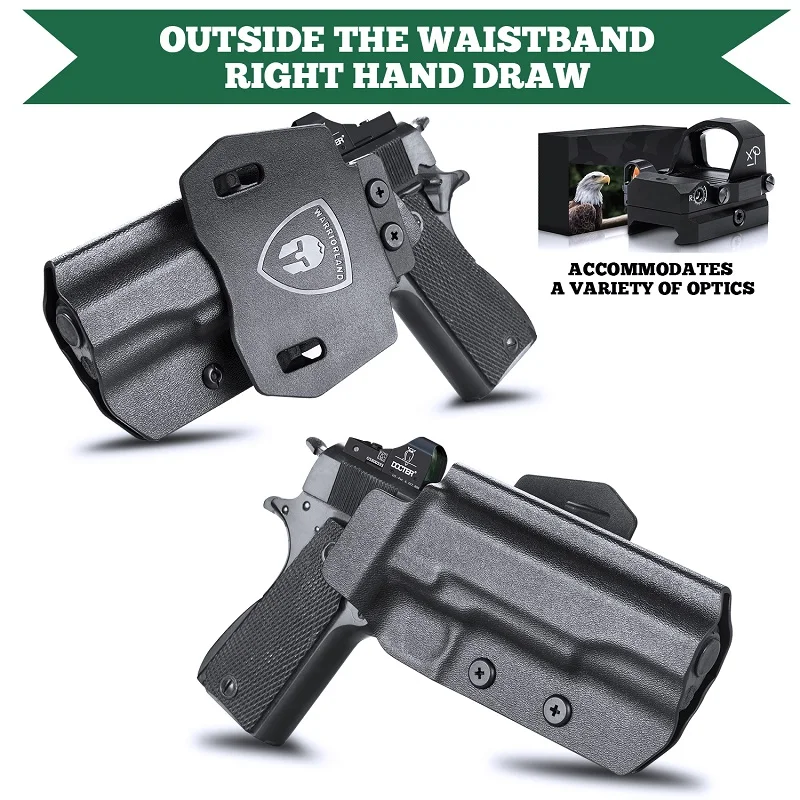 【Compatibility】 WARRIORLAND OWB Kydex holster fit: Colt 1911 45 ACP 5 "No carril incluyendo Colt/Fuerza de Élite/Kimber / Springfield / RIA / S & W / Ruger / Taurus / Rock Island y más de 1911 pistola También puede ser compatible con barril de 4,5 "o 4,25", si puede aceptar que el barril sea más larga que la funda corto (también puede cortar un poco y pulir el borde). Y encajaría con la mayoría de los puntos ópticos/rojos