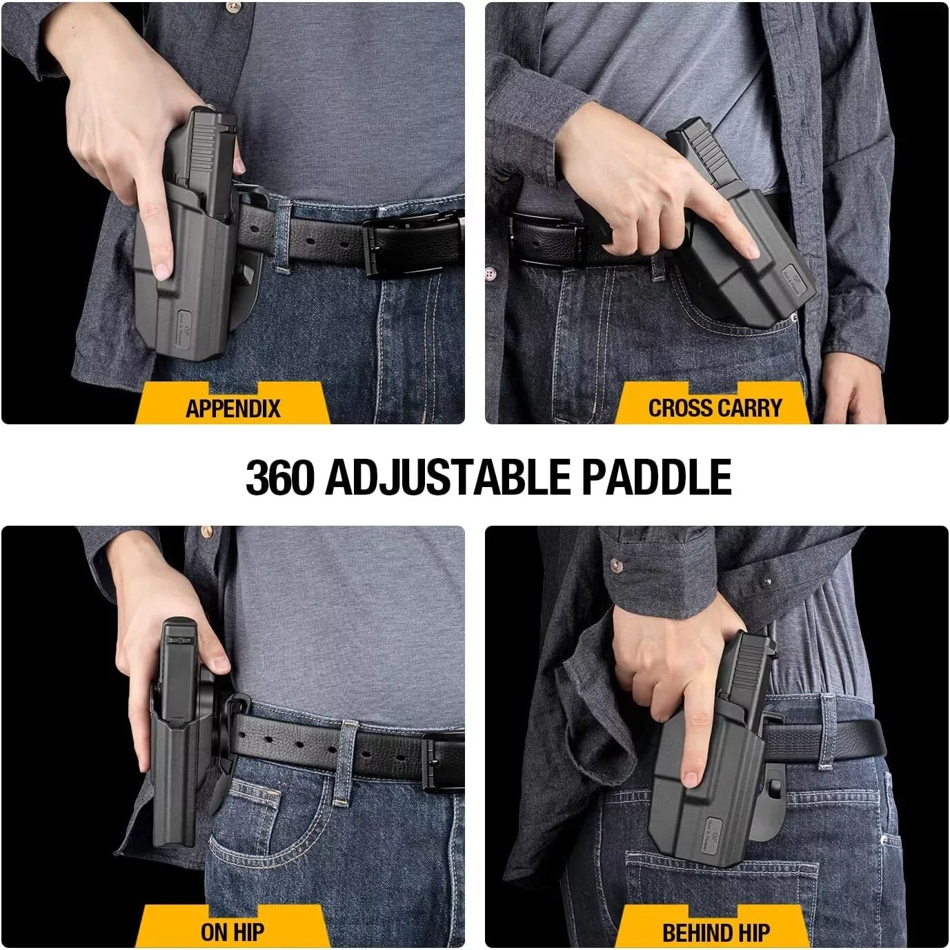 ALMOHADILLA AJUSTABLE DE 360 GRADOS CON SILICON SUAVE AJUSTADA: esta paleta se adapta a un cinturón de 1,5 pulgadas", 1,75 pulgadas y 2,0 pulgadas de ancho con silicona suave unida en el lado de la piel para que te sientas mejor cuando está contra tu piel. La paleta es ajustable en 360 grados para todas las posiciones de transporte.