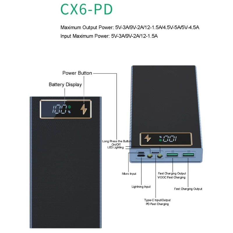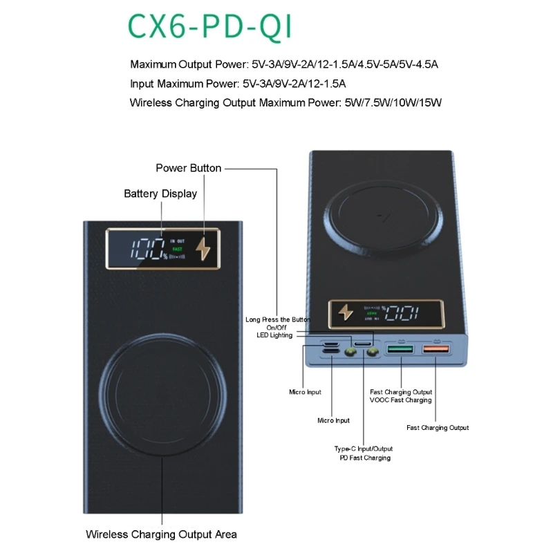Caja de alimentación CX6 PD Qi Entrada: 5V3A,9V2A,12V1.5A