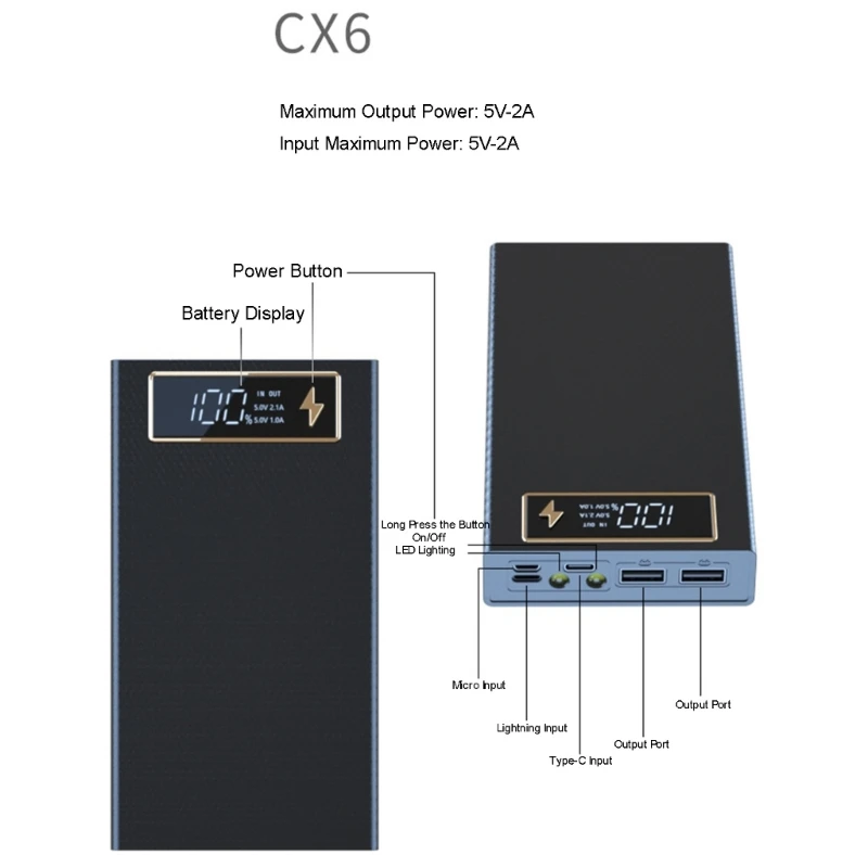 Caja de alimentación CX6 con salida de luz/entrada: 5V2.1A