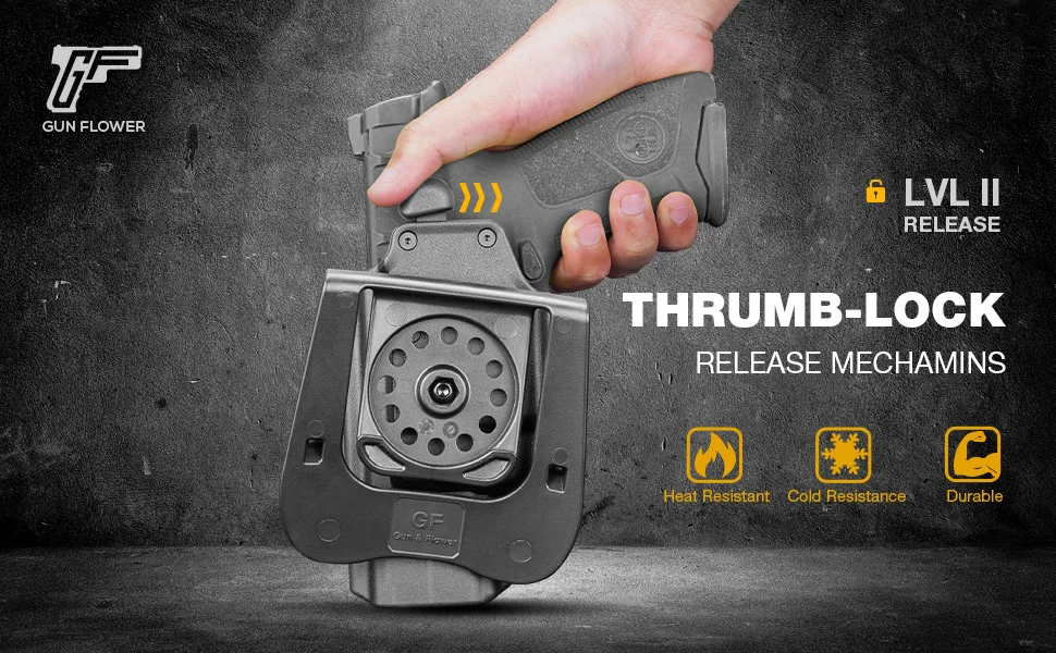 【Sistema de retención de nivel II】Retención de nivel II con sistema de liberación del dedo pulgar, eso significa que su arma permanecerá en la funda sin ninguna posibilidad de caerse a menos que presione el botón de liberación para realizar su sorteo suave.Perfecto para aplicación de la ley y uso personal.