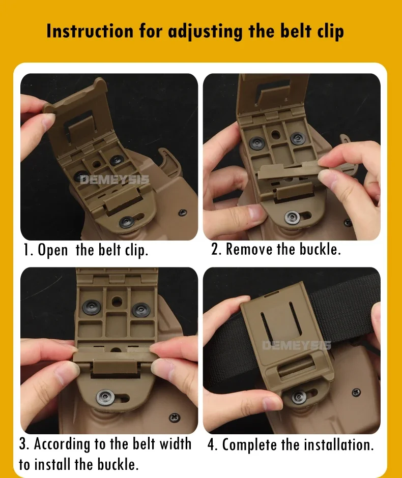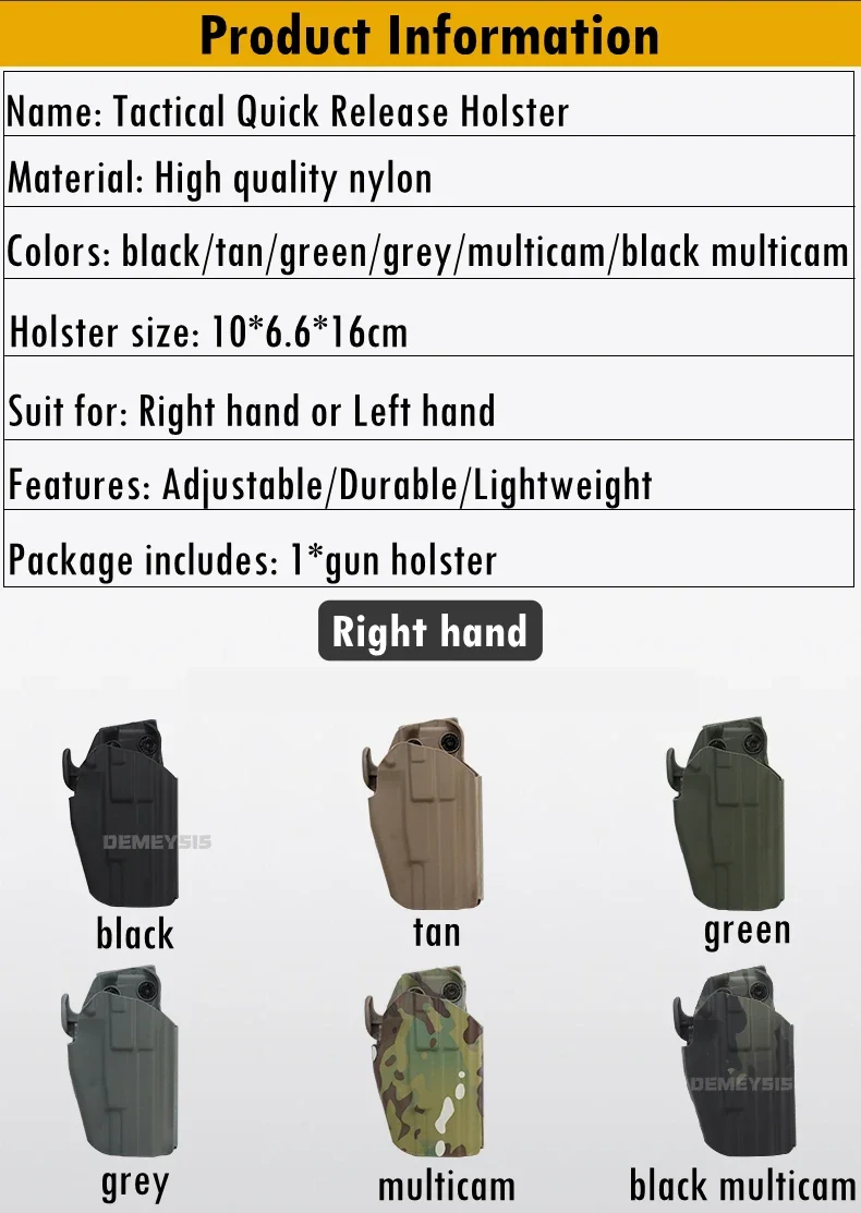 ●Con botón de liberación rápida.y el mecanismo de bloqueo automático bloqueará y sujetará automáticamente su arma de fuego de forma segura cuando la vuelva a colocar en la funda de la pistola.
