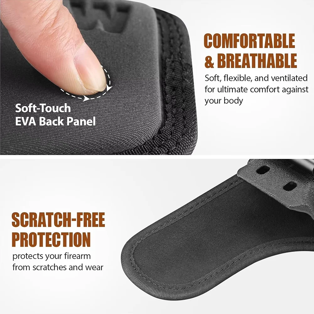 Comodidad híbrida y protección de acabado: combina una carcasa de polímero duradera estilo Kydex con un nailon multicapa transpirable y un respaldo de ante suave de EVA y microfibra para mayor comodidad y una protección superior del acabado del arma.