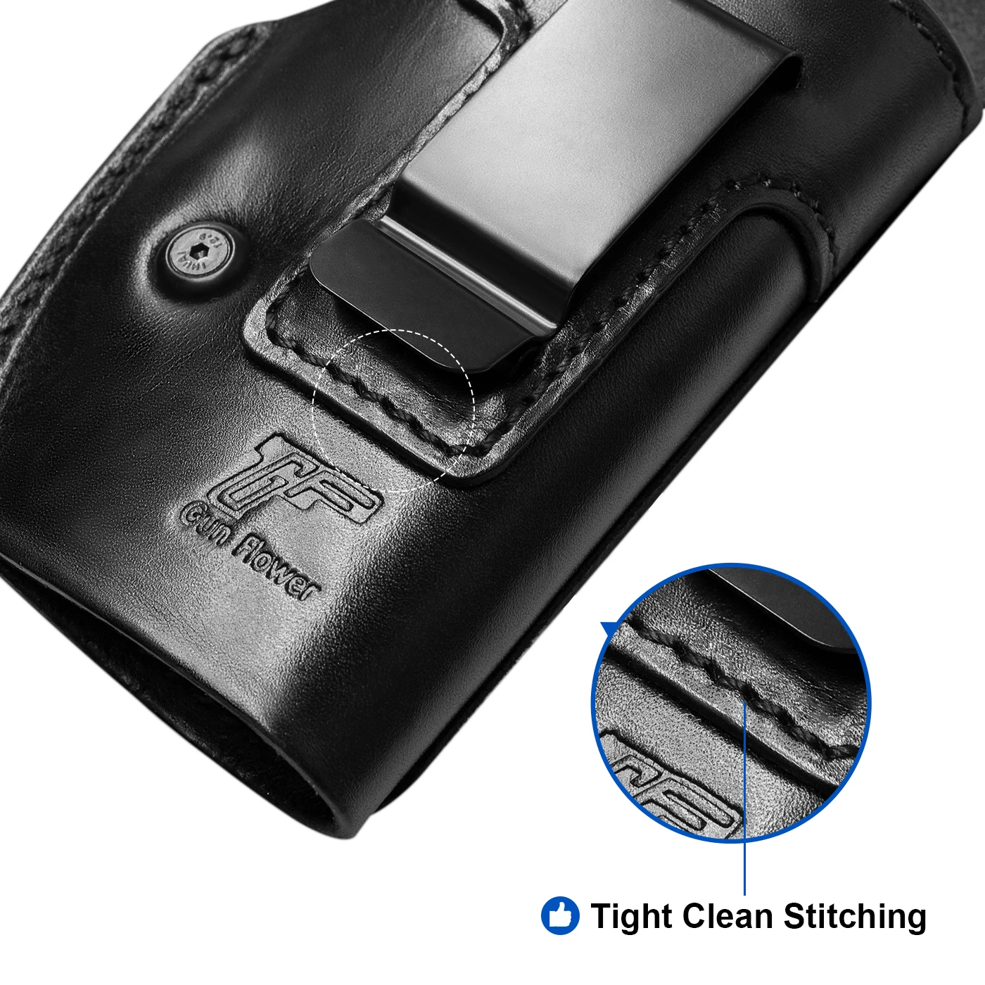 【Apertura reforzada con CUERO COMPLETO GRAIN】 Todo el cuerpo de esta funda de cuero está hecho de CUERO COMPLETO GRAIN.Además, cosimos dos capas de CUERO COMPLETO GRADO para asegurarnos de que la abertura mantendrá su forma y no colapsará cuando se retire la pistola.