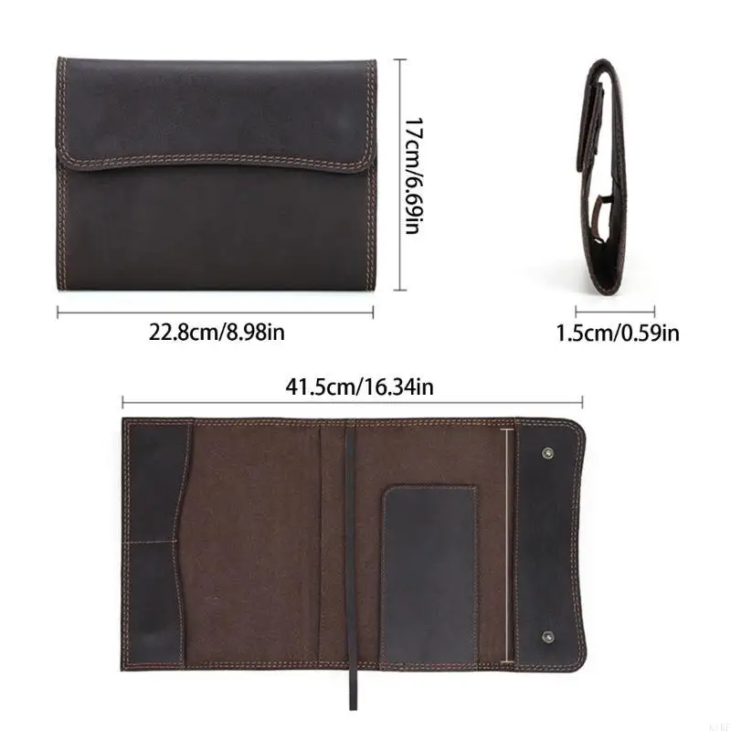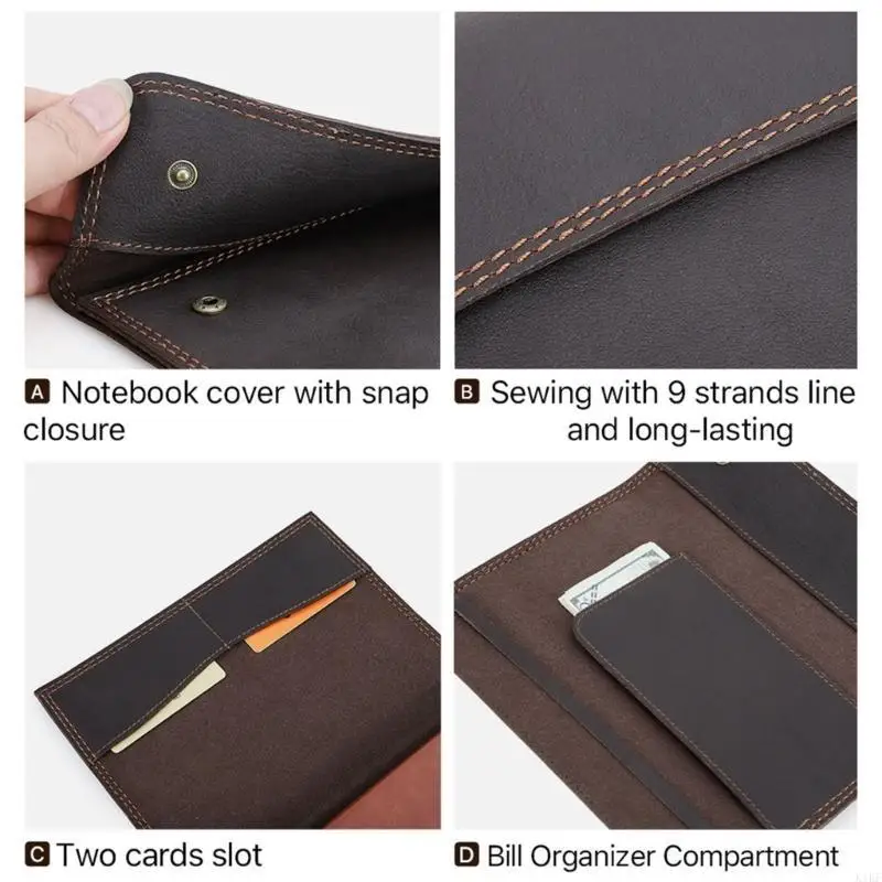 Diseñada con una práctica cubierta giratoria, 2 ranuras para tarjeteros integradas, divisor de páginas de marcapáginas de cuero de pu y bolsillo para efectivo, esta funda protectora para cuaderno de cuero de pu garantiza un fácil acceso y organización, mientras que su compatibilidad de tamaño compacto se adapta perfectamente a los cuadernos estándar.