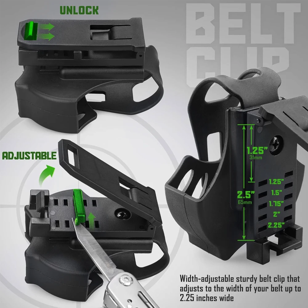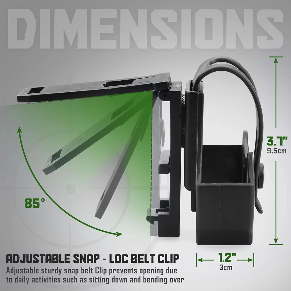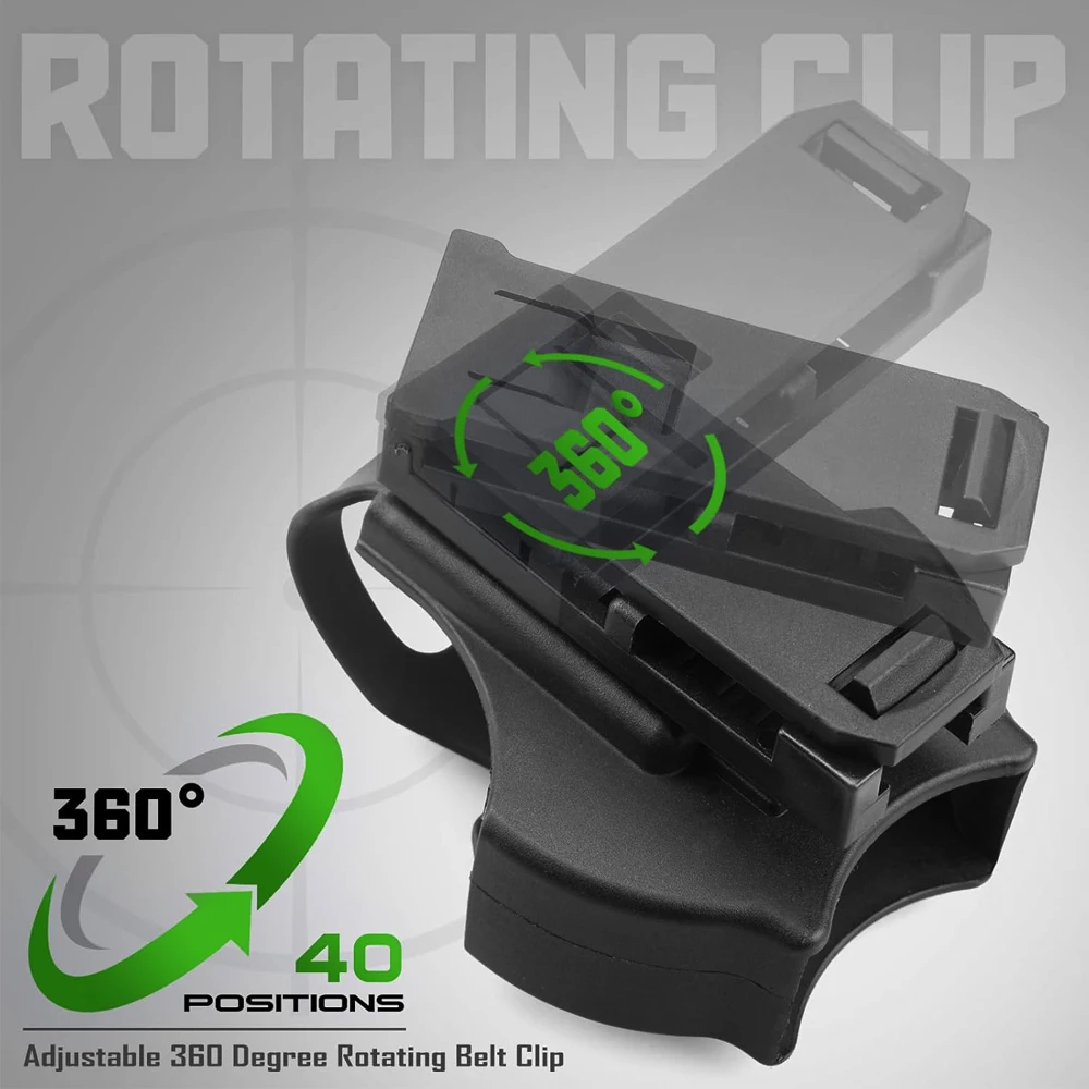 El soporte para esposas está equipado con un nuevo 360° Clip giratorio para cinturón en la parte posterior.El soporte para esposas se adapta a cinturones normales de 1,5"-2", cinturones tácticos y chalecos Molle de una amplia gama de aplicaciones, adecuados para su uso en diferentes entornos.El 360° La rotación del clip trasero permite mantener el estuche de las esposas en un ángulo conveniente para retirar rápidamente las esposas, lo que facilita su uso en escenarios de servicio y patrulla.