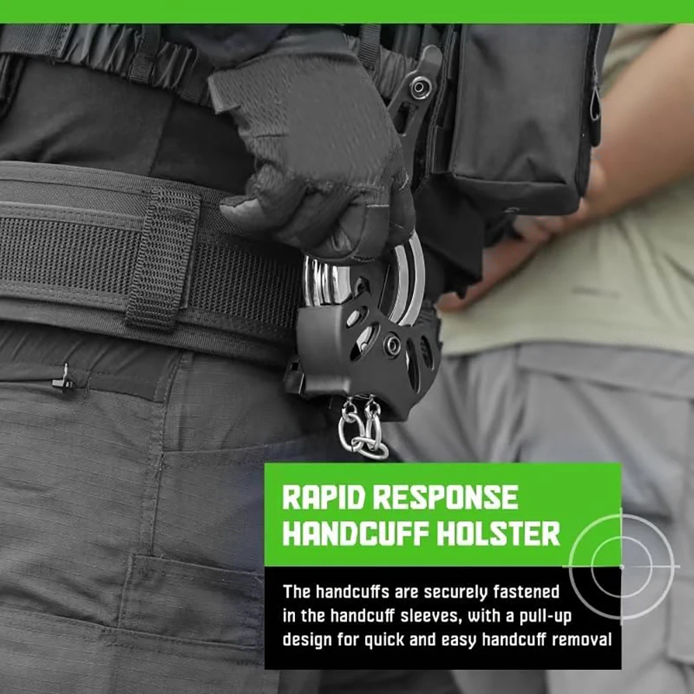 Cuenta con una hebilla de latón negro mate de alta calidad que puede mantener las esposas en su lugar y evitar caídas accidentales en las esposas.La funda para esposas se beneficia de una robustez mejorada con un clip para cinturón que permite tirarla a diario o al sentarse y agacharse a diario sin aflojarse y provocar que la funda para esposas se caiga, lo que la hace adecuada para patrullas en servicio. oficiales así como entusiastas de la táctica.