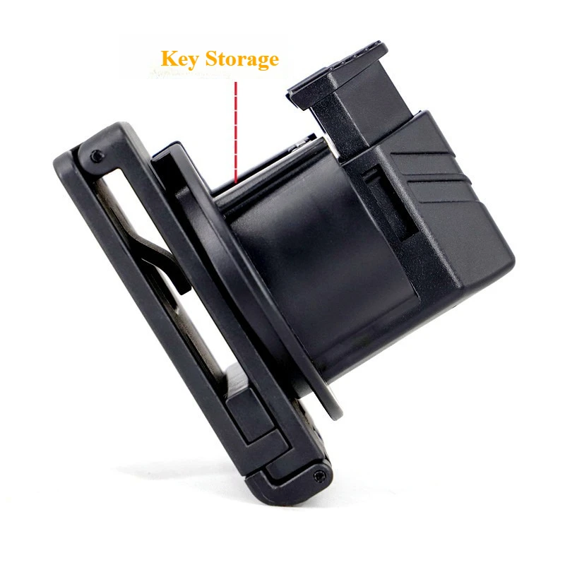 Características: El material es resistente y duradero, con un diseño novedoso y simple que se puede enganchar a cinturones dentro de un ancho de 5,5 cm.Está diseñado con un orificio para la colocación de llaves, logrando integración y permitiendo una carga y descarga fácil y rápida.