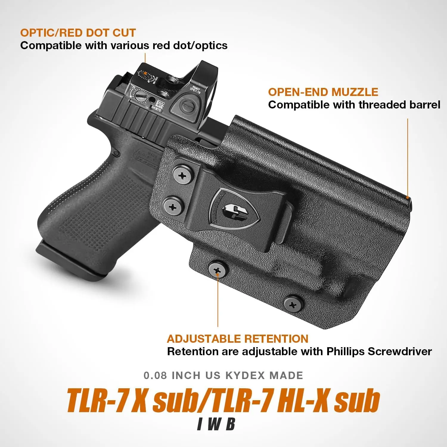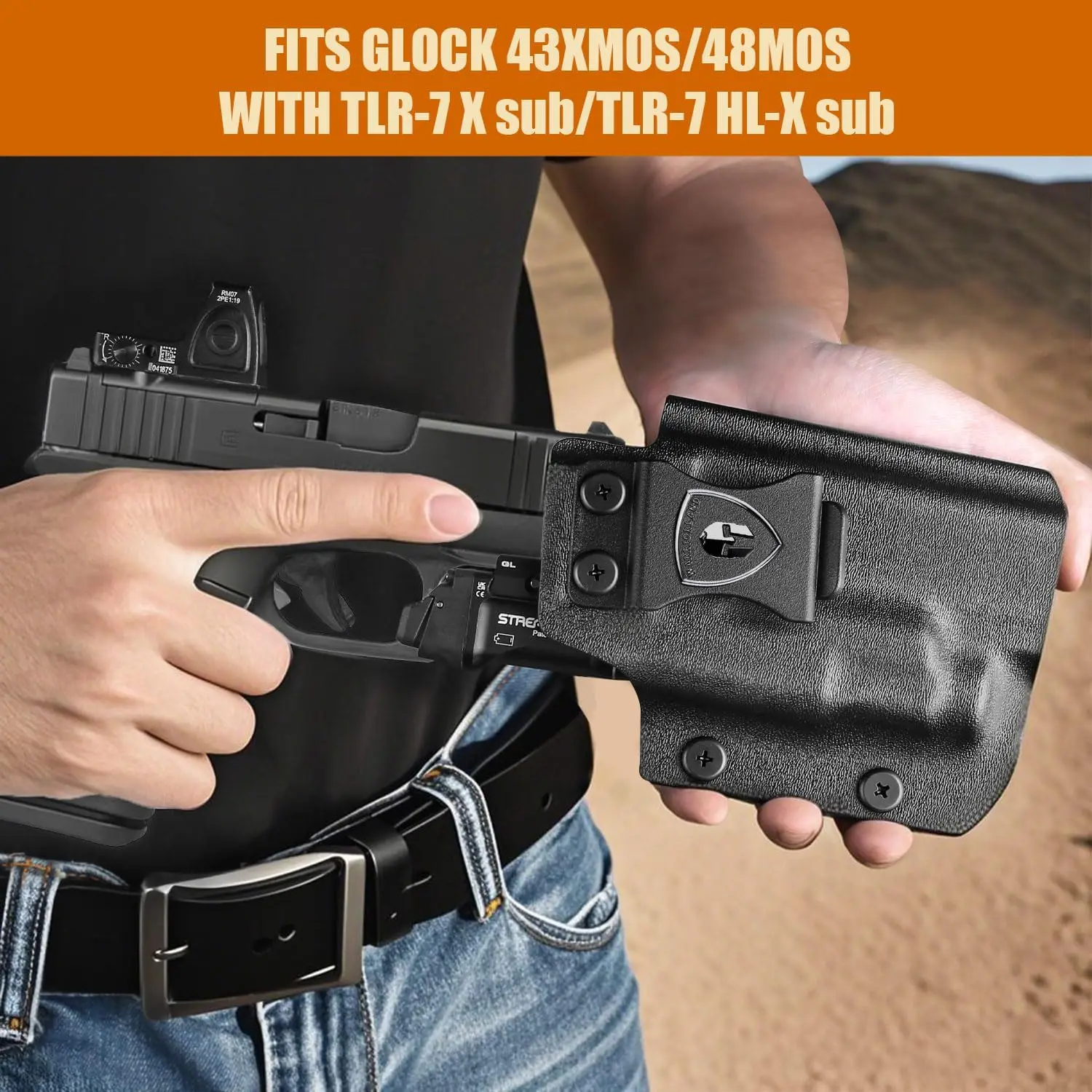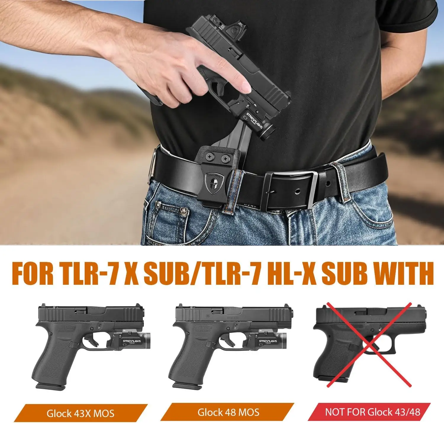 Ajuste perfecto: moldeado con precisión para Glock 43X MOS / 48 MOS con luces secundarias Streamlight TLR-7 X Sub / TLR-7 HL-X, lo que garantiza un ajuste seguro y cómodo.Solo mano derecha (Nota: no es compatible con Glock 43 / 43X o 48)