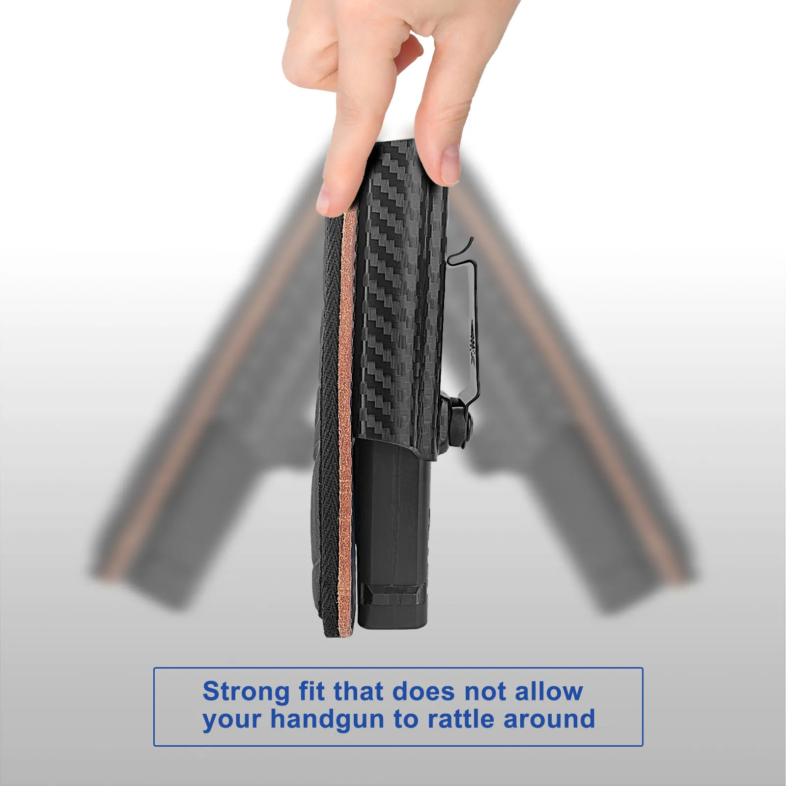 El diseño del protector del gatillo Kydex proporciona una cobertura completa del gatillo, una inserción efectiva accidental de los dedos, evitando posibles accidentes. El diseño del protector de longitud completa puede evitar eficazmente que la pistola entre en contacto con la piel.