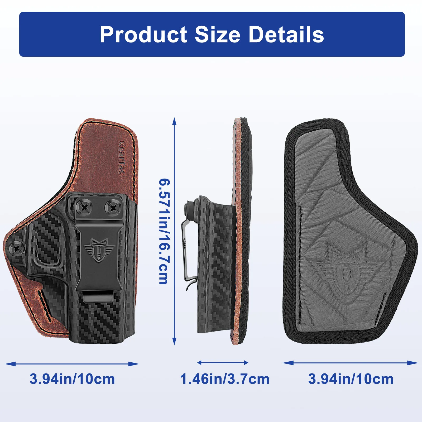 La funda híbrida combina la durabilidad de Kydex con la comodidad del cuero y el amortiguador del acolchado de espuma, utiliza un diseño acolchado de espuma en el respaldo, lo que garantiza una experiencia de transporte segura y cómoda y resuelve la incomodidad de los plásticos duros e la impresión durante el transporte, se adapta al uso durante todo el día.