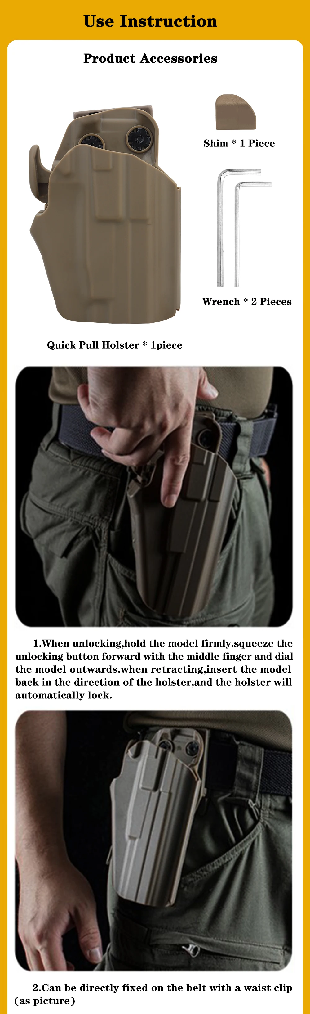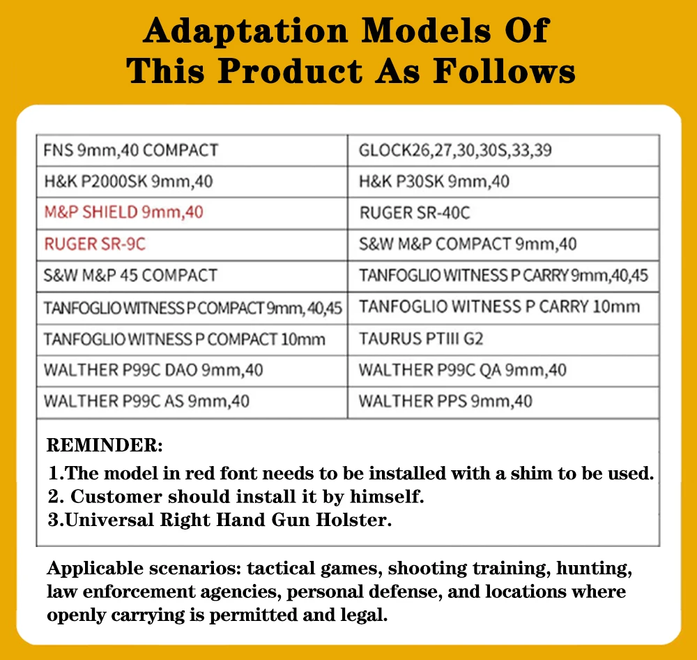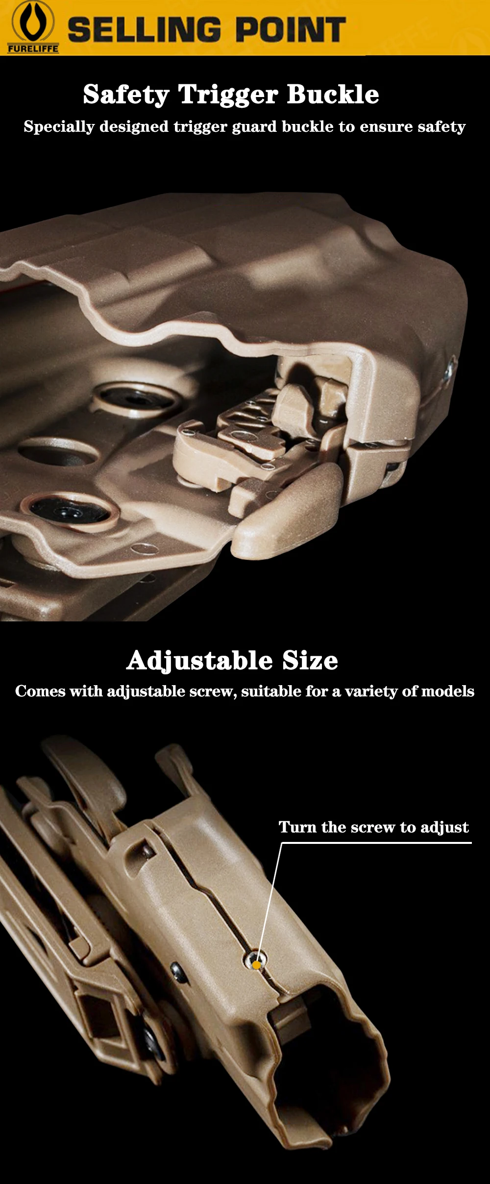 - Ajuste versátil:Compatible con más de 30 tipos de pistolas, lo que garantiza un ajuste perfecto con una amplia gama de pistolas, incluidos los modelos GLOCK.