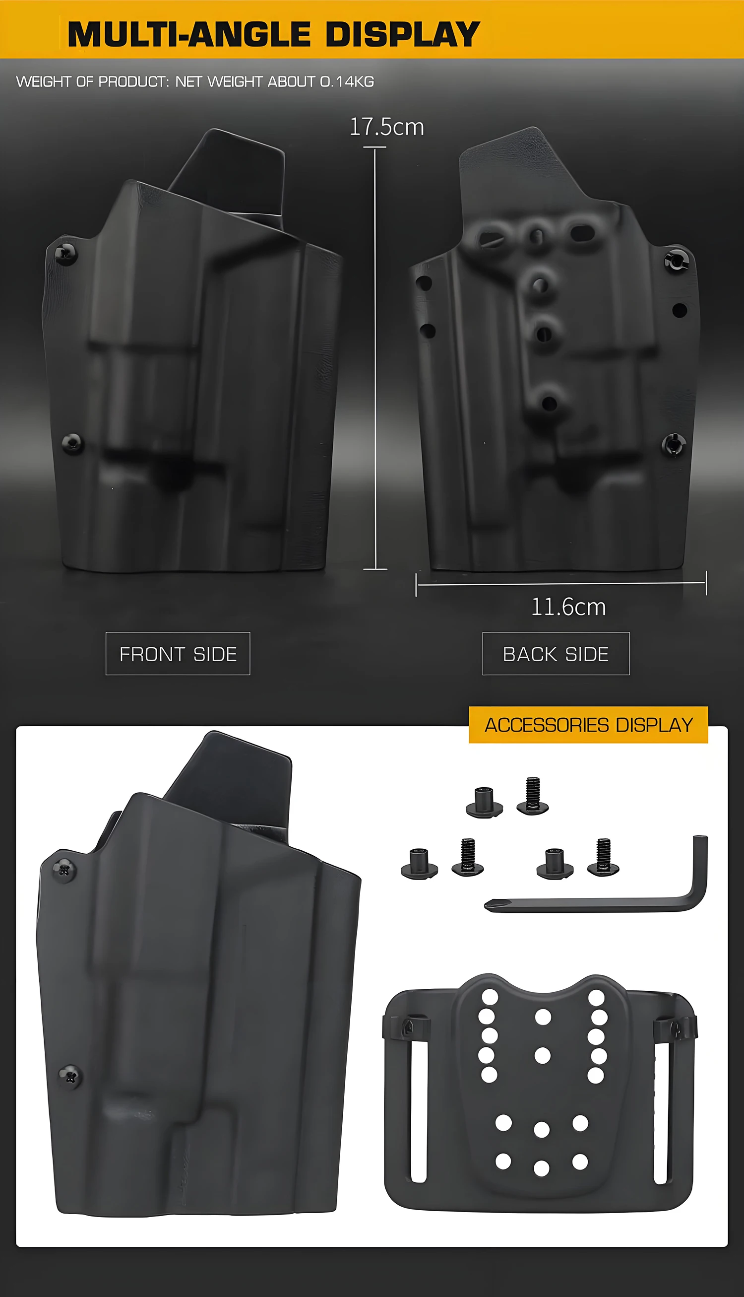 ✔ Transporte seguro y flexible: diseñado para un transporte seguro de OWB (exterior de la cintura).El diseño robusto garantiza que su arma permanezca en su lugar hasta que la necesite, brindando confianza durante el movimiento y el funcionamiento.