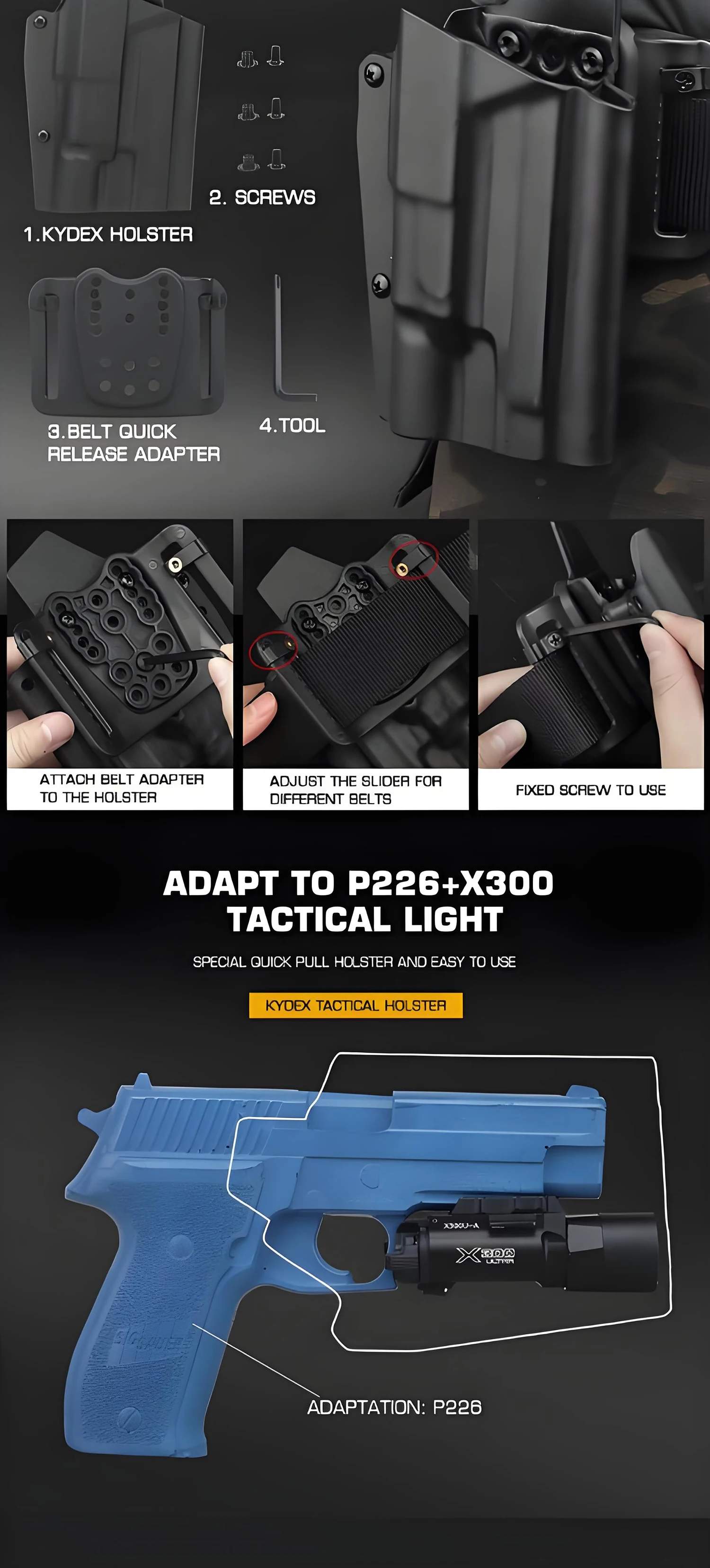 ✔ Ajuste perfecto para P226 + X300: moldeado exclusivamente para el SIG Sauer P226 con una luz para arma SureFire X300 adjunta, lo que garantiza un ajuste cómodo y seguro que protege su equipo y permite un dibujo suave y consistente en todo momento.