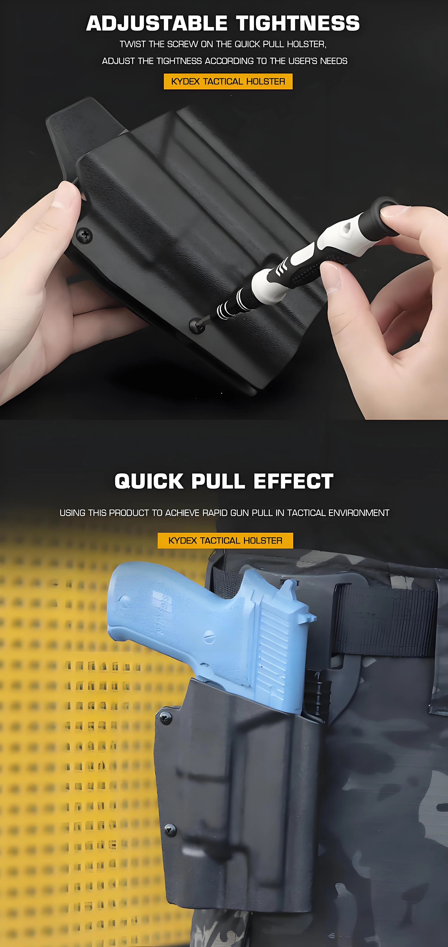✔ Tiro rápido y retención ajustable: Logre un tirón rápido del arma en situaciones críticas.El tornillo de ajuste de tensión le permite personalizar la estanqueidad según sus preferencias personales, equilibrando perfectamente la seguridad con velocidad de tracción.