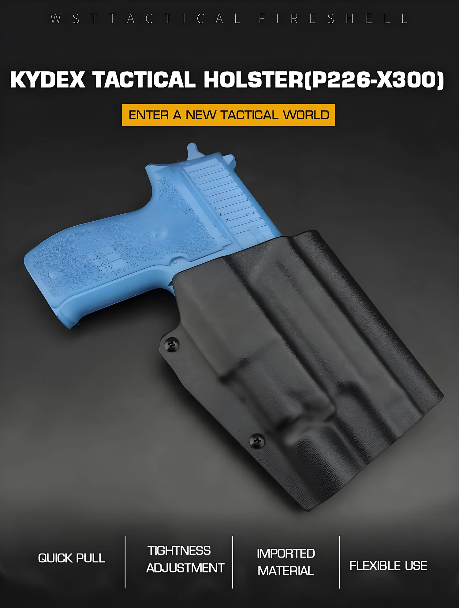 La funda táctica Kydex está meticulosamente diseñada para un ajuste perfecto con la pistola SIG Sauer P226 equipada con una luz táctica SureFire X300.Fabricada con Kydex premium importado de EE. UU., esta funda garantiza una retención segura del arma, un dibujo rápido sin esfuerzo y un transporte versátil de OWB (exterior de la cintura).Ya sea para tareas profesionales, fuerzas del orden, airsoft o entrenamiento táctico, es el compañero definitivo y confiable para su arma de fuego.