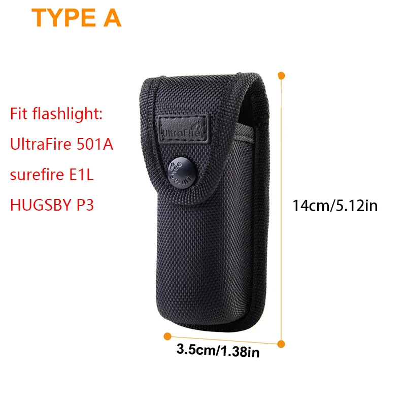 1.El tipo A es adecuado para el diámetro de la cabeza de la linterna: 3,5 cm, longitud adecuada de la linterna: 11 cm, ancho de cinturón adecuado: 6 cm.Adecuado para UltraFire 501A surefire E1L,UGSBY P3 y otros modelos de linterna;