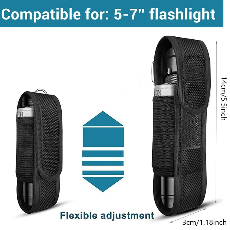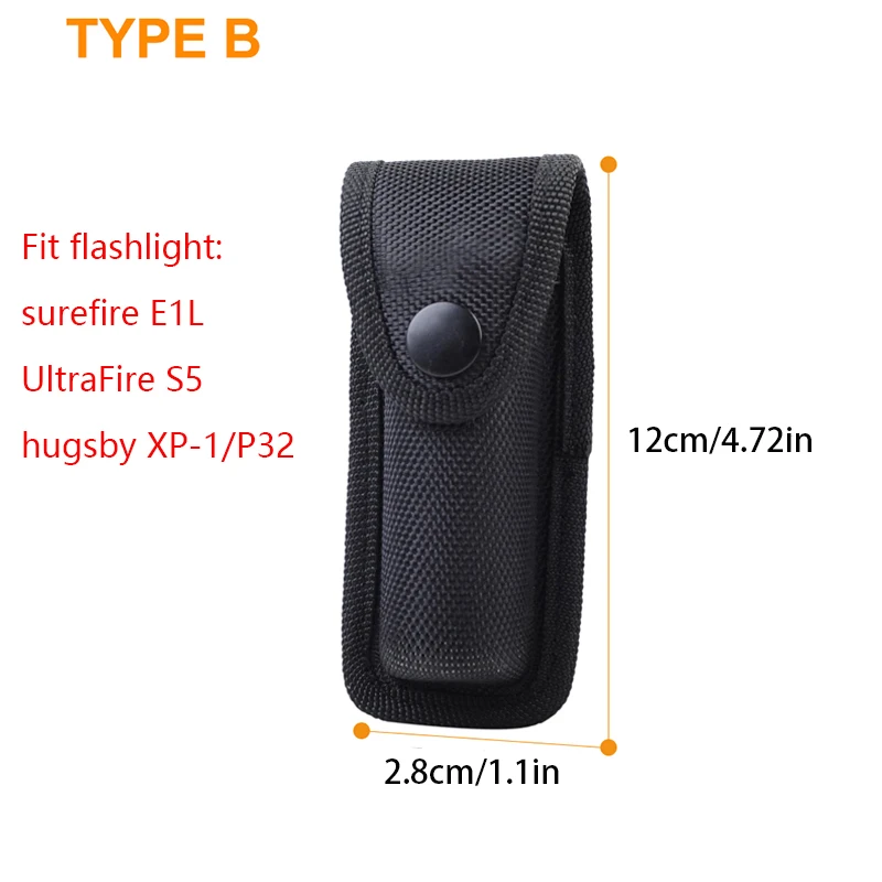2.El tipo B es adecuado para el diámetro de la cabeza de la linterna: 2,5 cm, longitud adecuada de la linterna: 10 cm, ancho de cinturón adecuado: 4 cm.Adecuado para surefire E1LUltraFire S5hugsby XP-1/P32 y otros modelos de linternas;