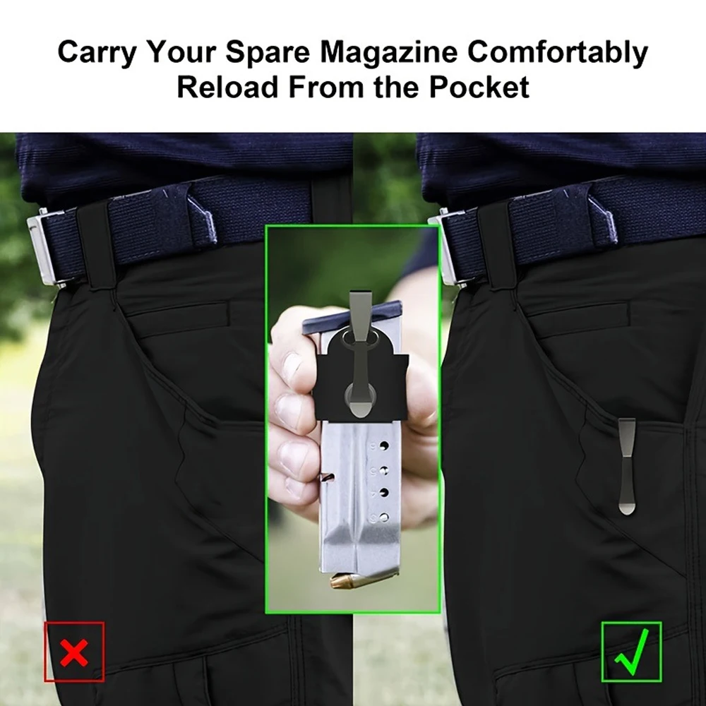 ✔️ LLEVAMOS EXTRA DE SEGURIDAD EN SU BOLSILLO: no deje que nuestro clip para cargador rebote con sus llaves y cambio de repuesto.En su lugar, asegúrelo discretamente con el portar revistas de bolsillo.