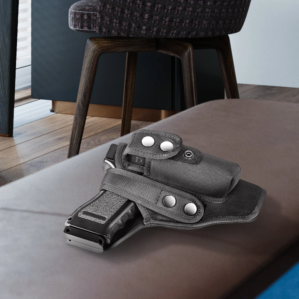 3. 【Funda para pistola de 9 mm para derecha e izquierda】 Nuestra funda duradera se puede utilizar tanto a derecha como a izquierda.Cambia el lugar según tu hábito.Se puede sujetar a un cinturón de 2 pulgadas de ancho.